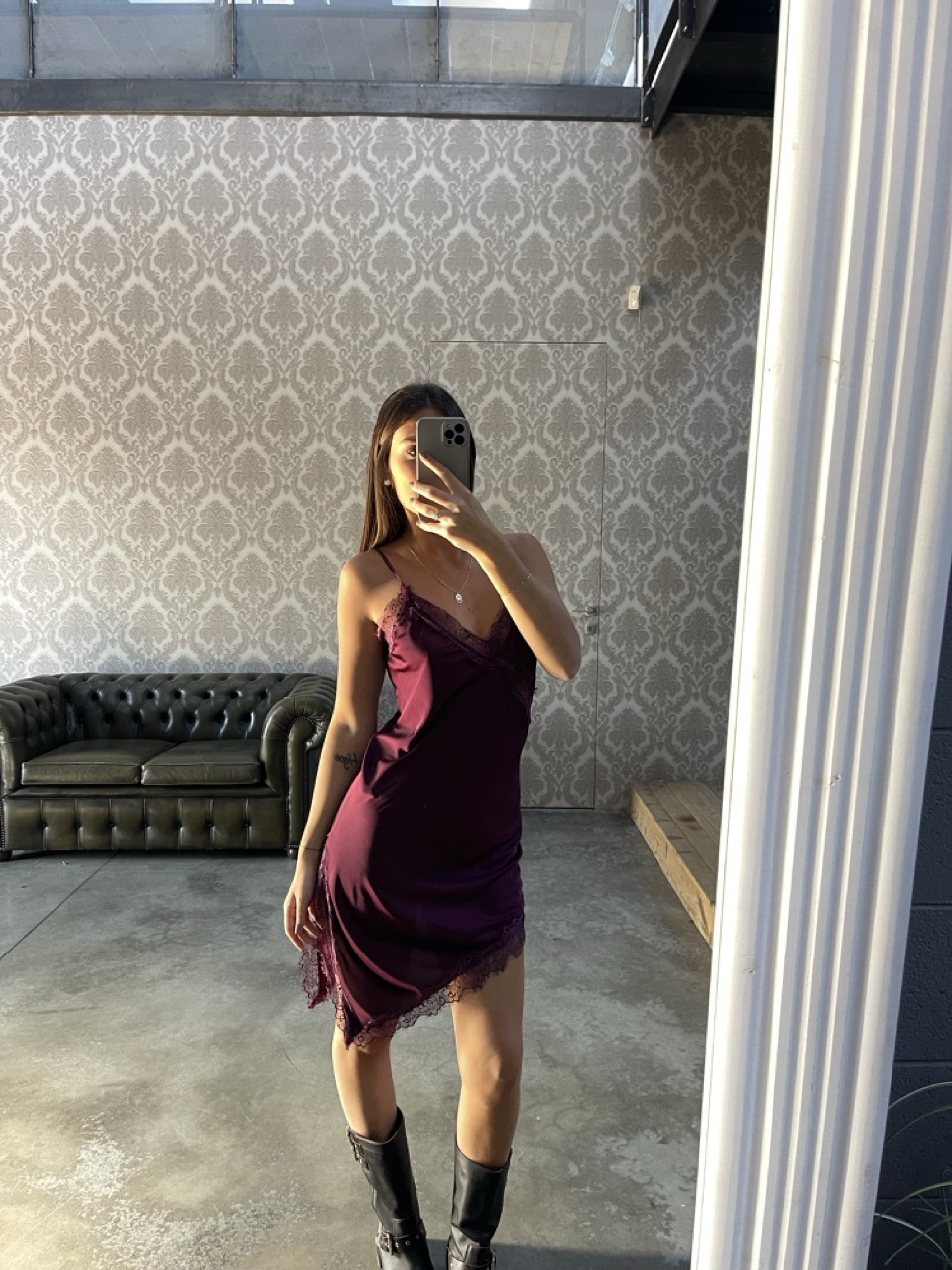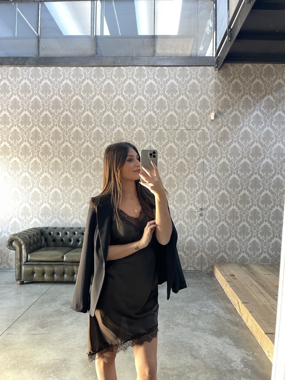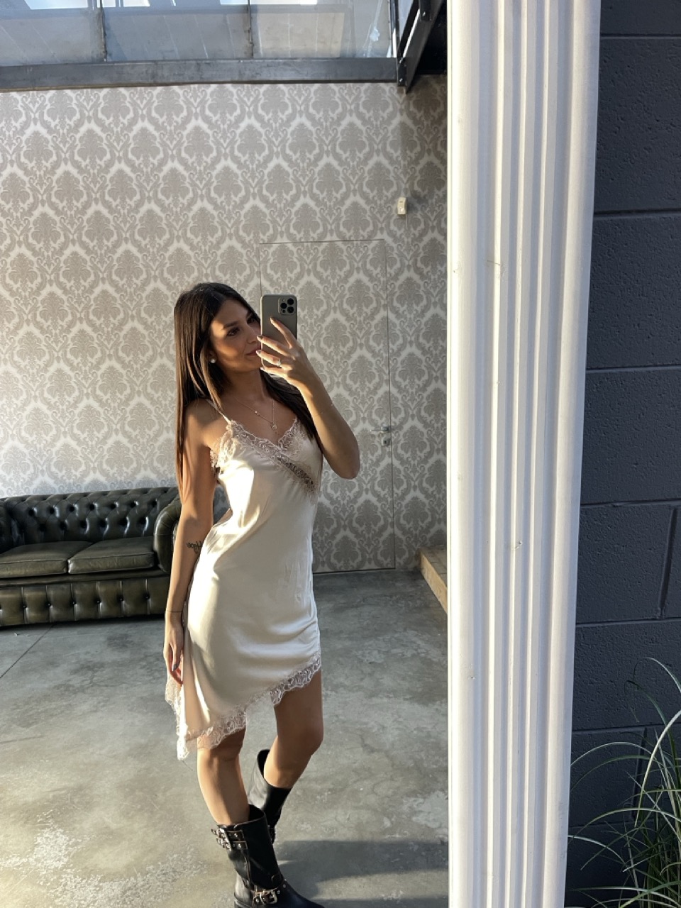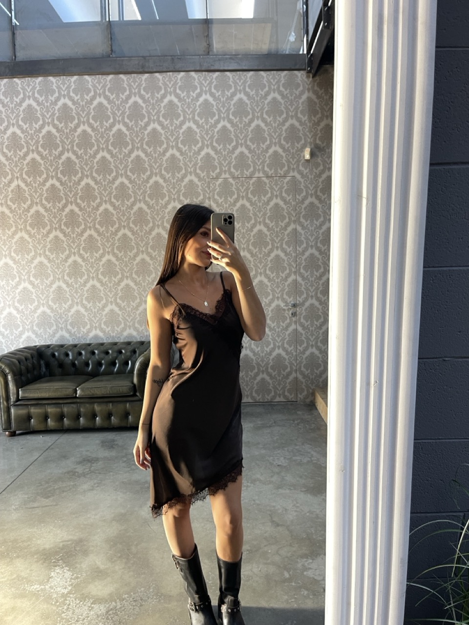 Abitino effetto raso con spalline fini non regolabili e dettaglio di pizzo.