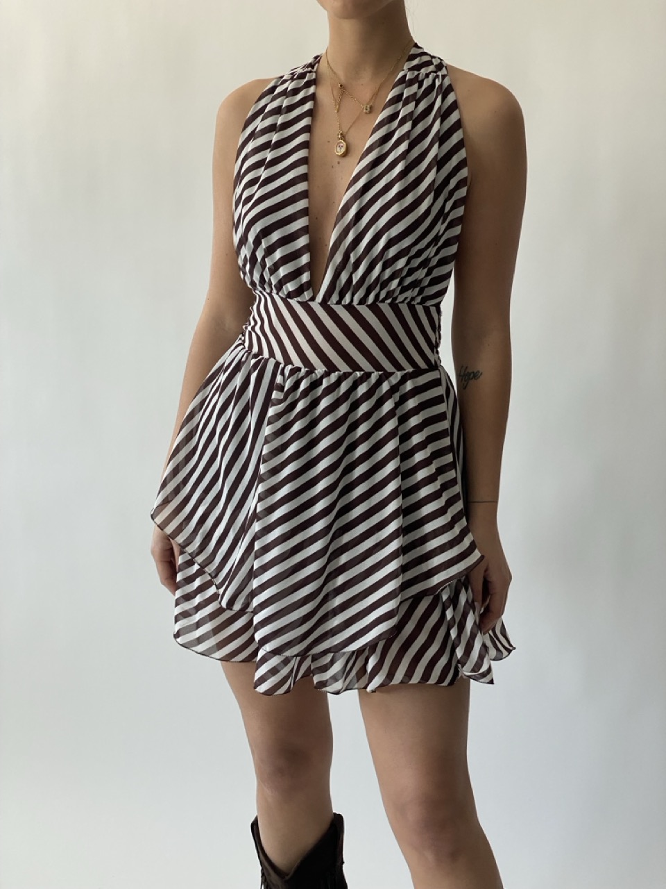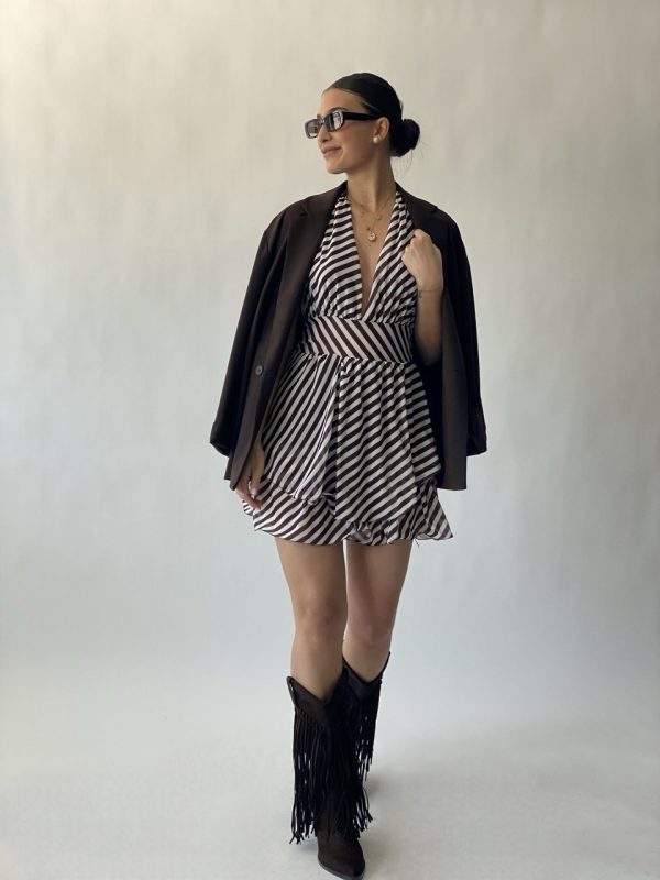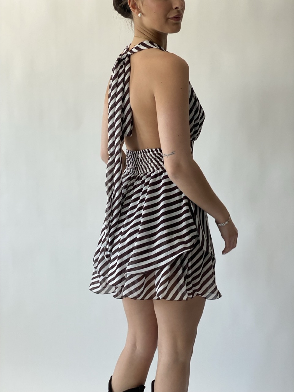 Abitino in fantasia a righe con elastico in vita e schiena scoperta.