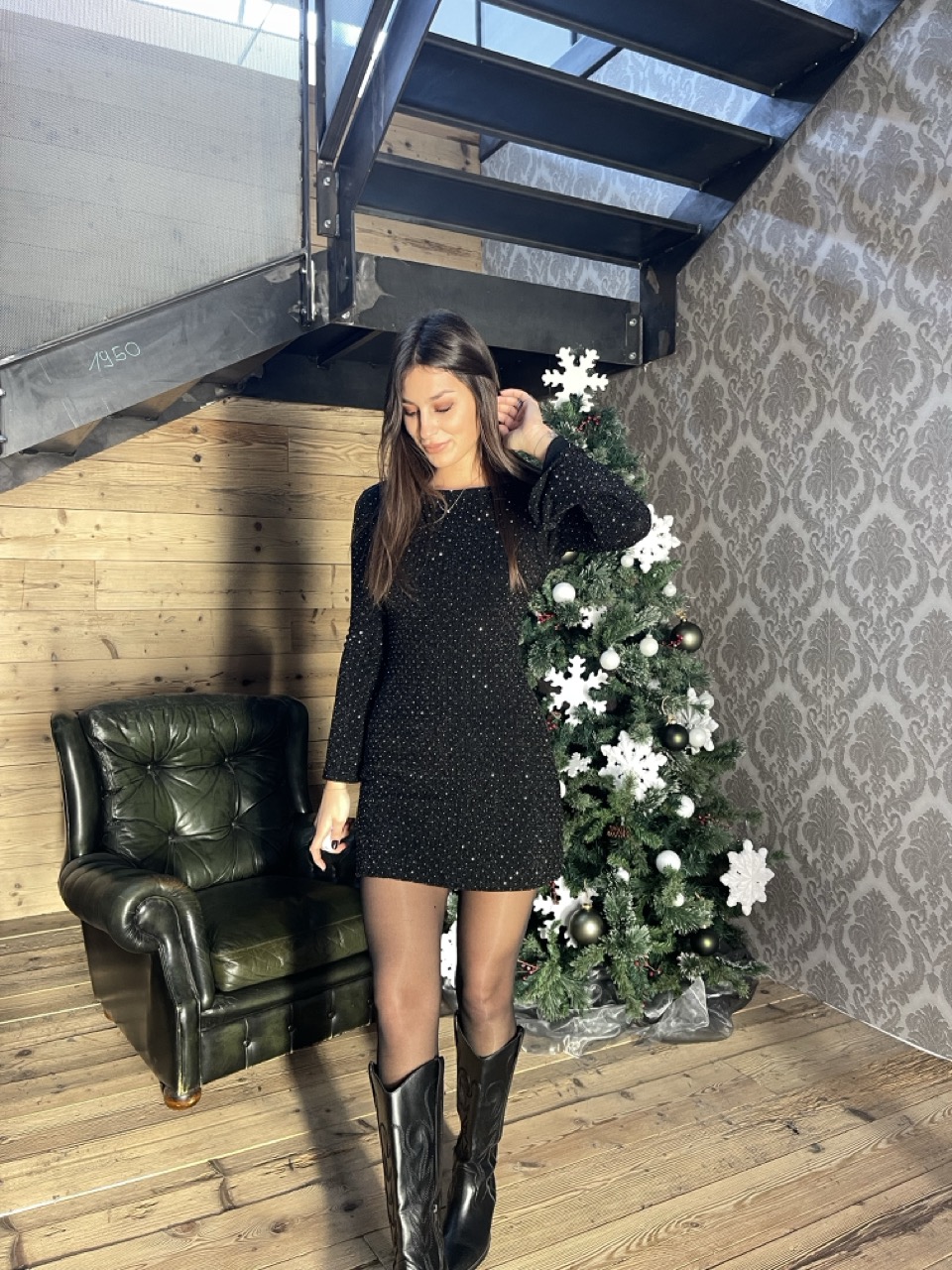 Abitino morbido con strass dettaglio e apertura sulla schiena con fiocco.