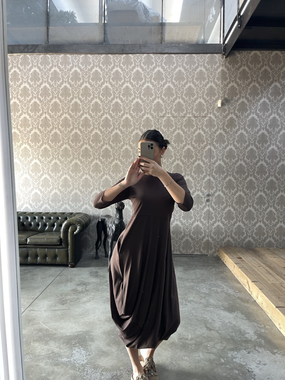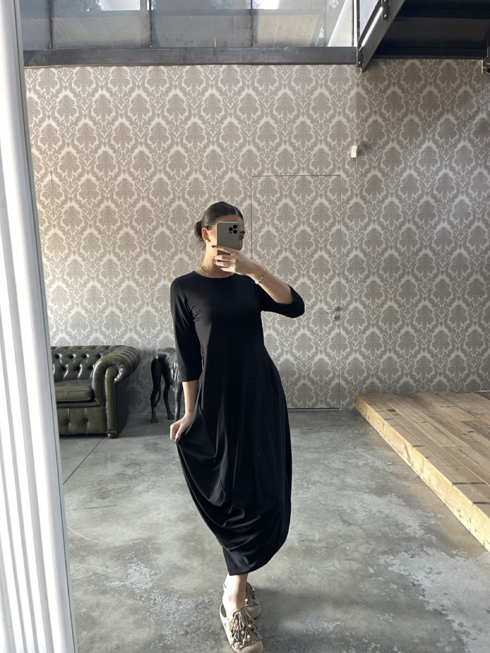 Abito midi modello a palloncino con maniche a 3/4 e tasche laterali.
