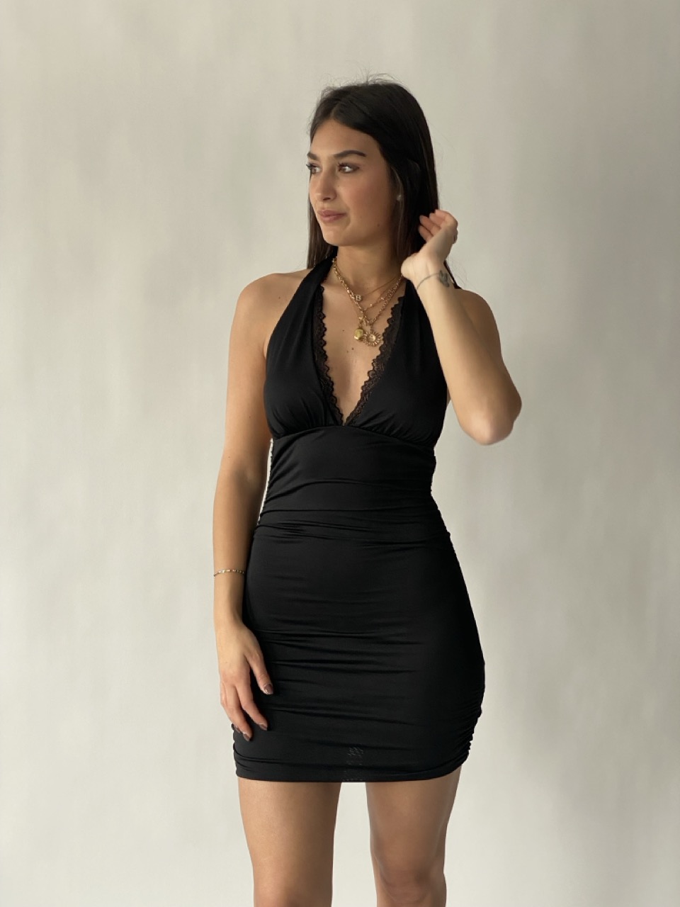 Abito aderente/elasticizzato con arricciatura, schiena scoperta, coppe preformate e fiocco dietro.