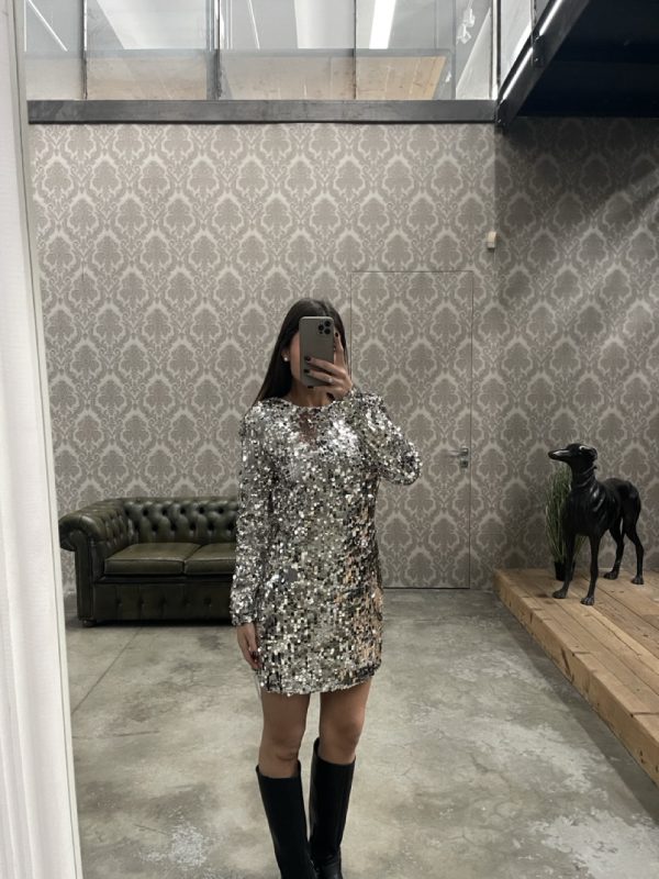 Abitino con dettaglio di paillettes e piccola apertura dietro con bottoncino come chiusura.
