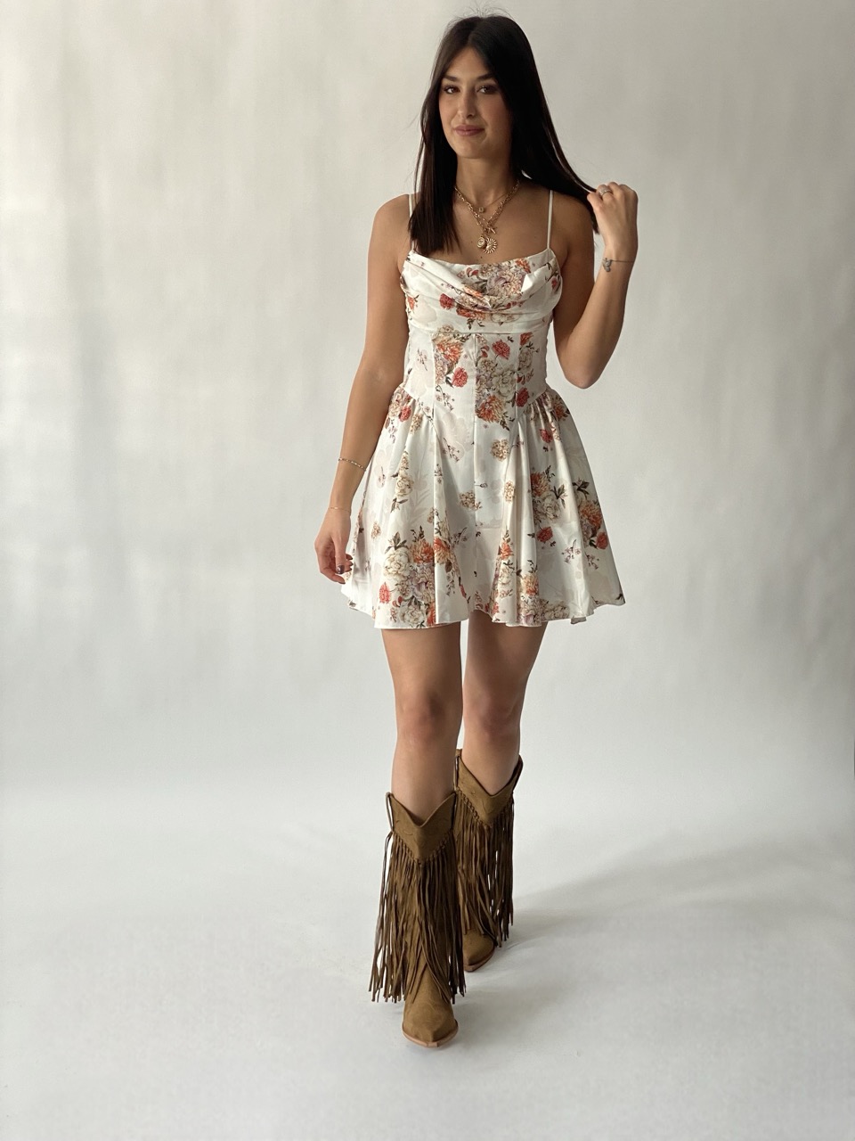 Abito in fantasia con coppe preformate, spalline fini regolabili e fiocco dettaglio dietro.
