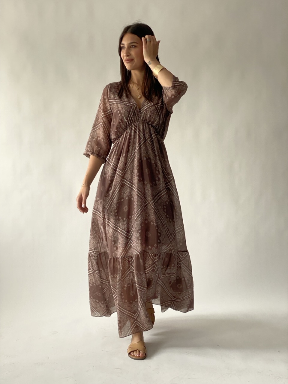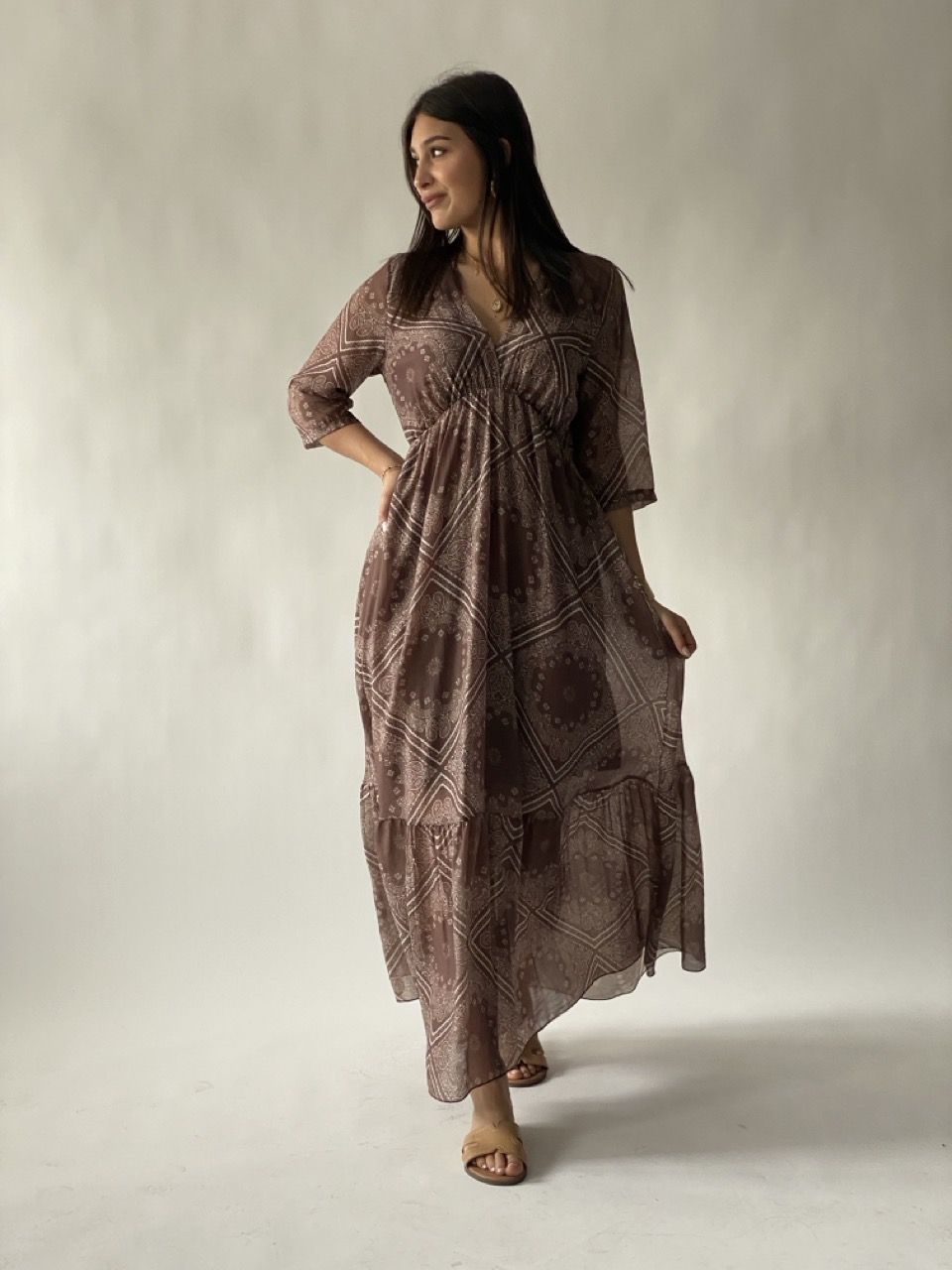 Abito lungo SUSY MIX in fantasia con scollo a V ed elastico in vita.