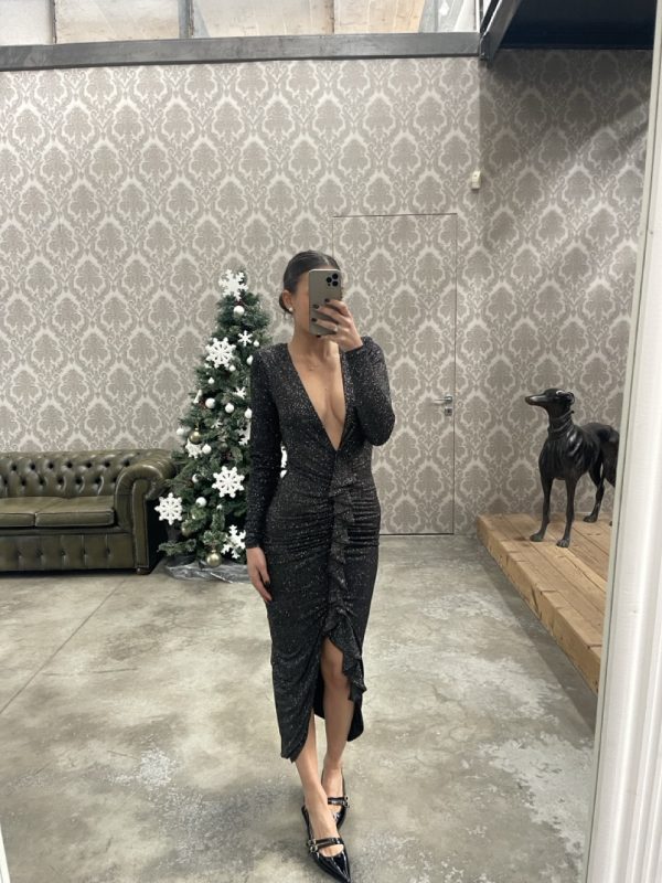 Abito midi aderente/elasticizzato con strass dettaglio, arricciatura, spalline imbottite e zip dietro come chiusura.
