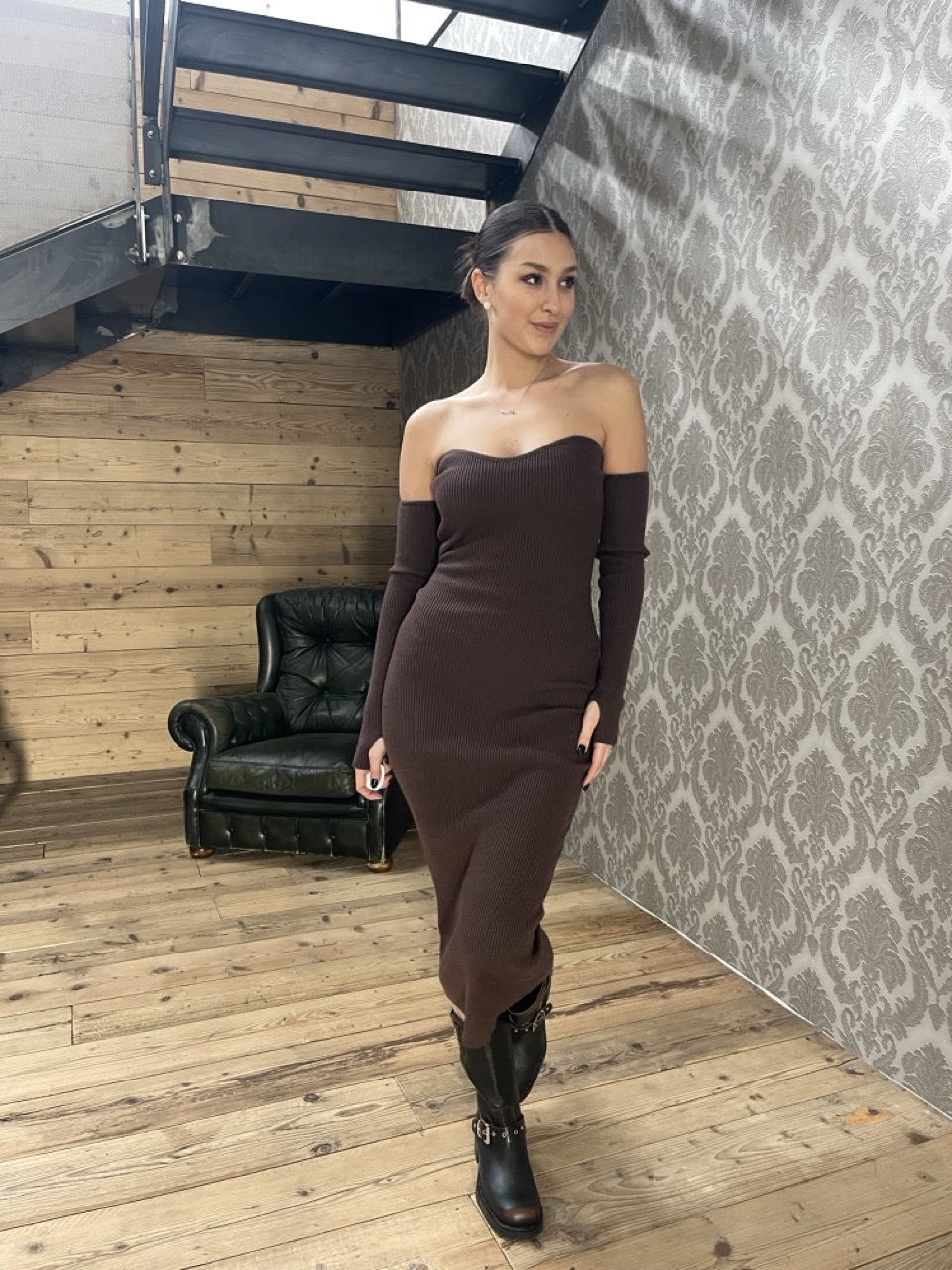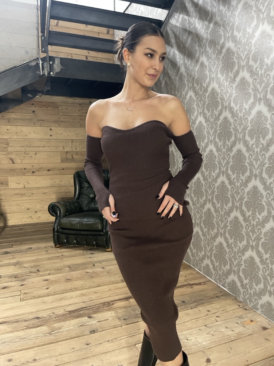 Abito midi modello a costine aderente/elasticizzato con scollo a cuore.