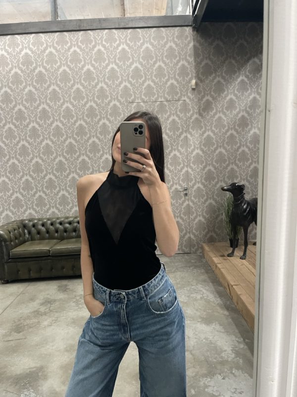 Body in velluto VICOLO aderente/elasticizzato con dettaglio di trasparenze e schiena scoperta.