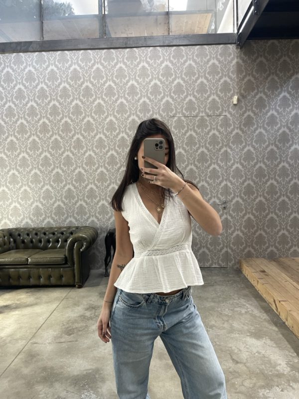 Camicetta con scollo a V con apertura sulla schiena e chiusura con fiocchi dettaglio.