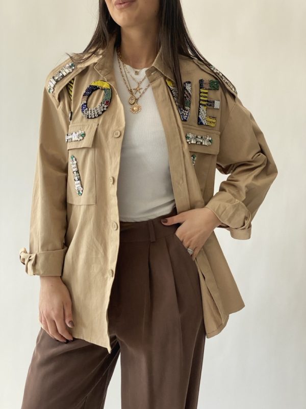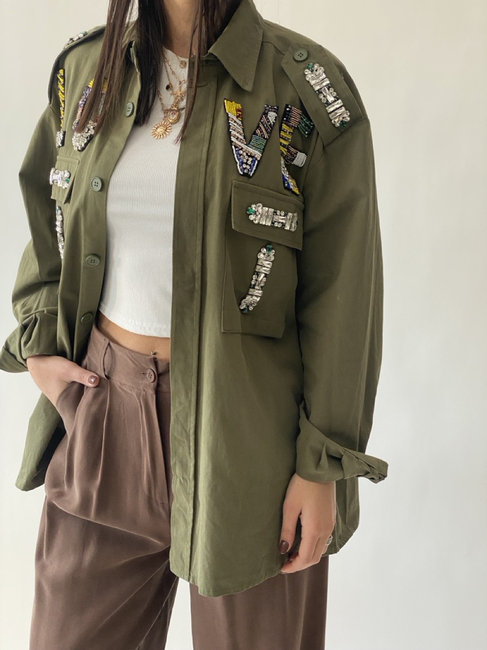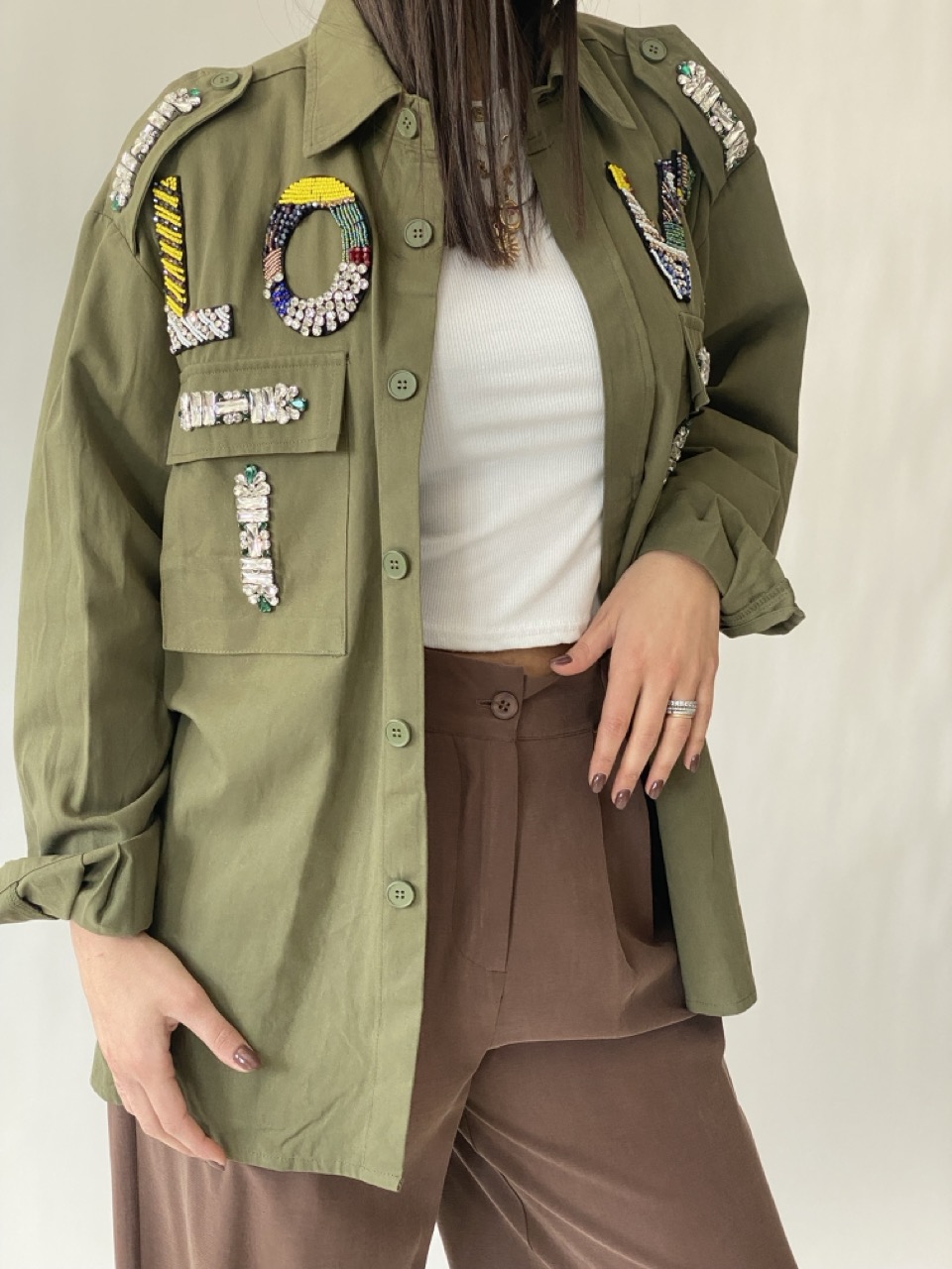 Camicia morbida con strass dettaglio, tasche frontali e chiusura con bottoni centrali.