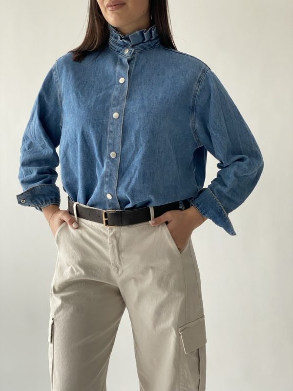 Camicia in denim con volant sul collo e chiusura con bottoni centrali a clip.
