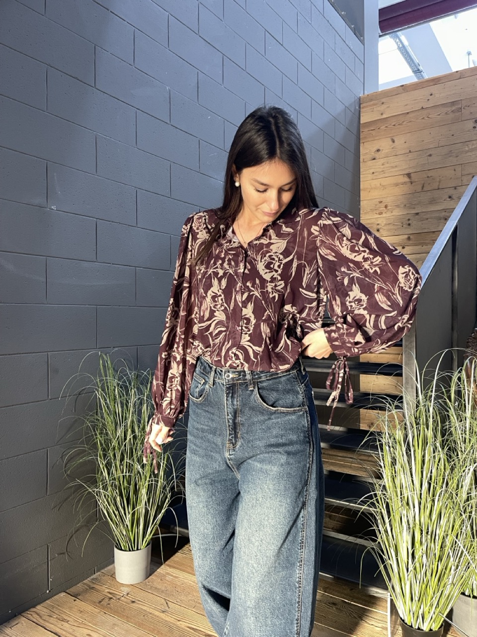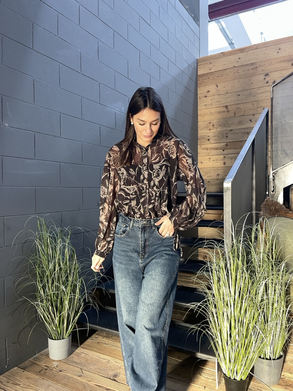 Camicia morbida NANEBI in fantasia con trasparenze e bottoni centrali come chiusura.