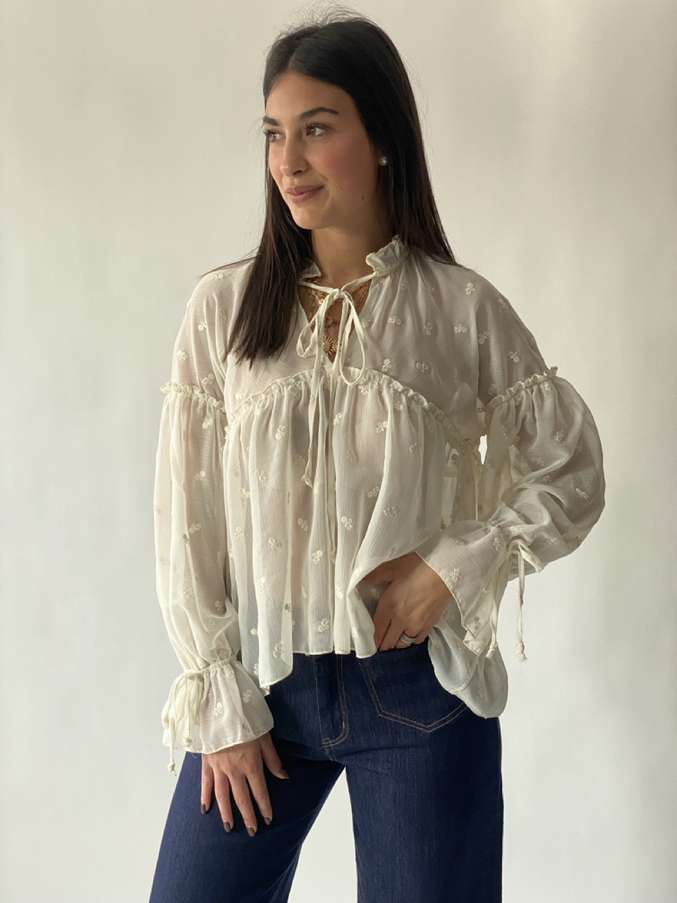 Camicia SUSY MIX con ricami dettaglio e fiocco davanti.