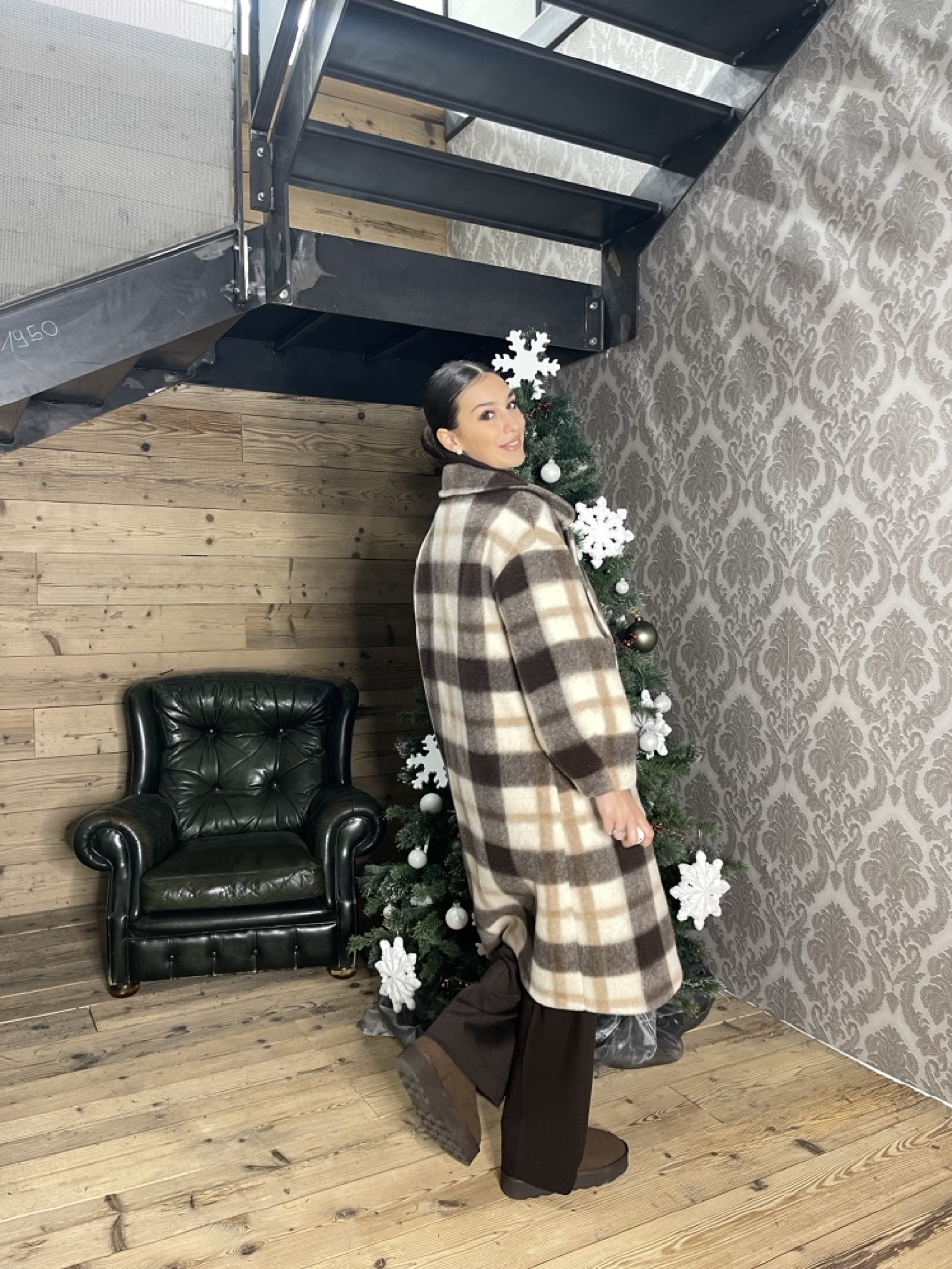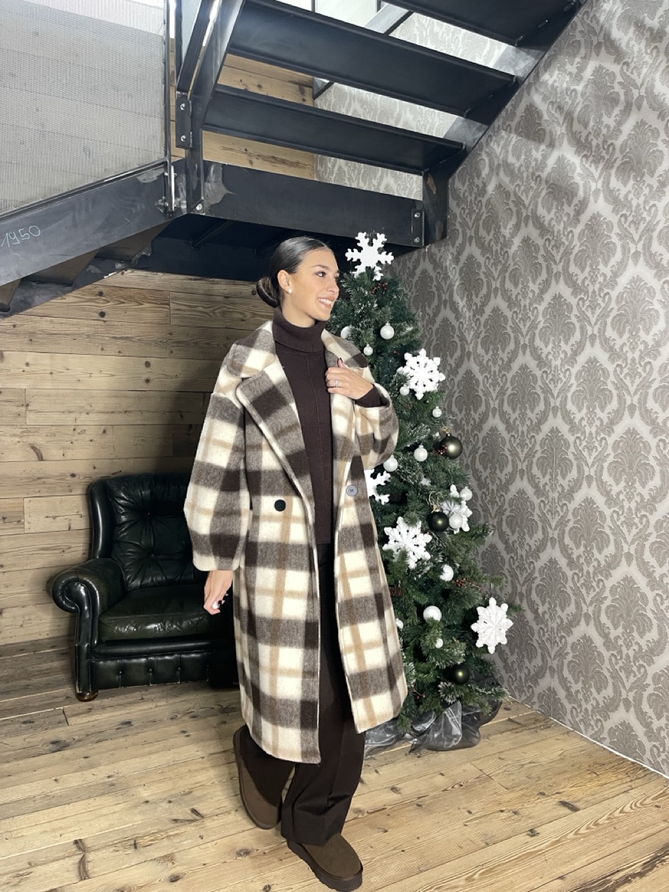 Cappotto in fantasia a quadri modello doppiopetto con tasche laterali.
