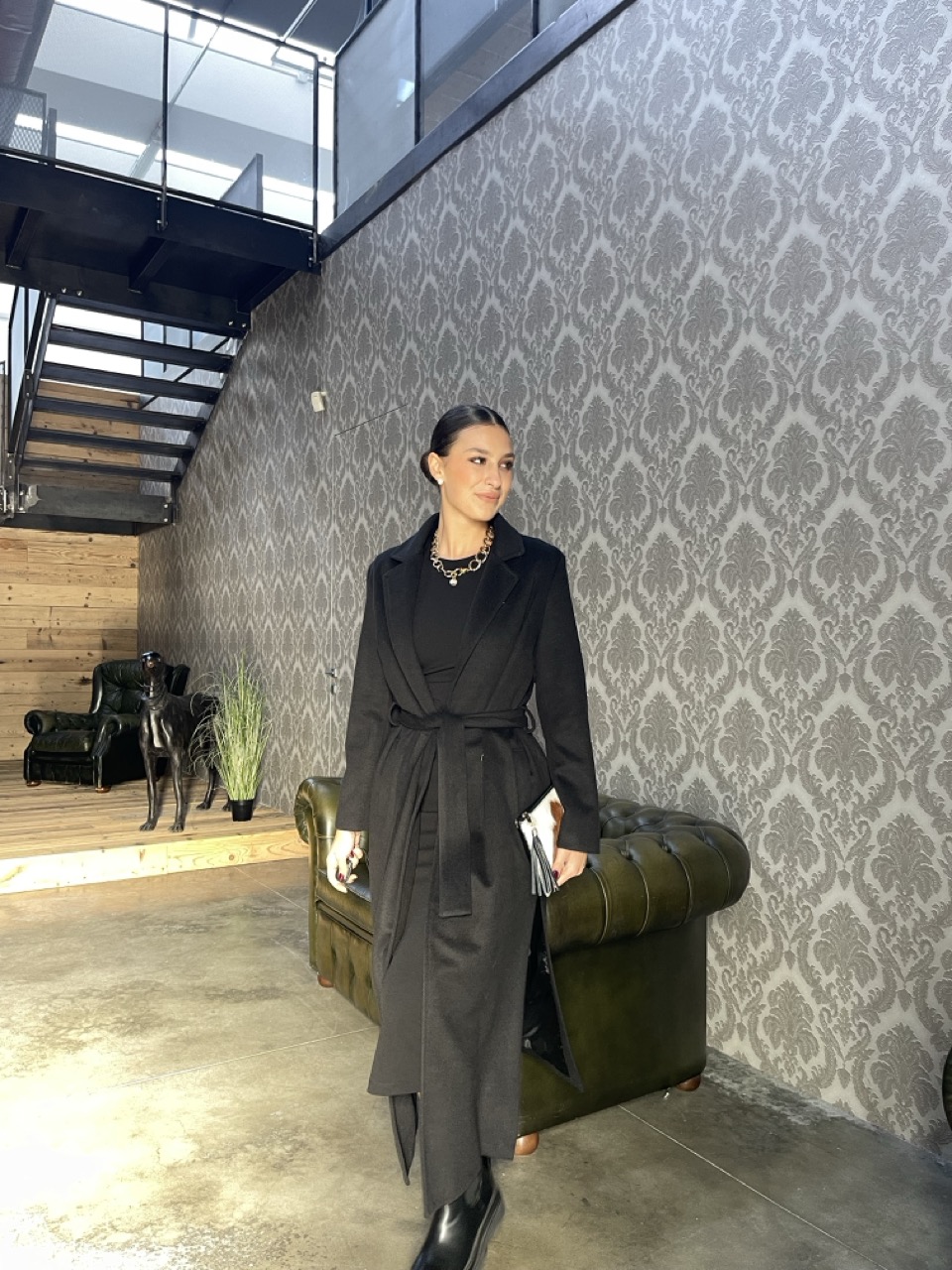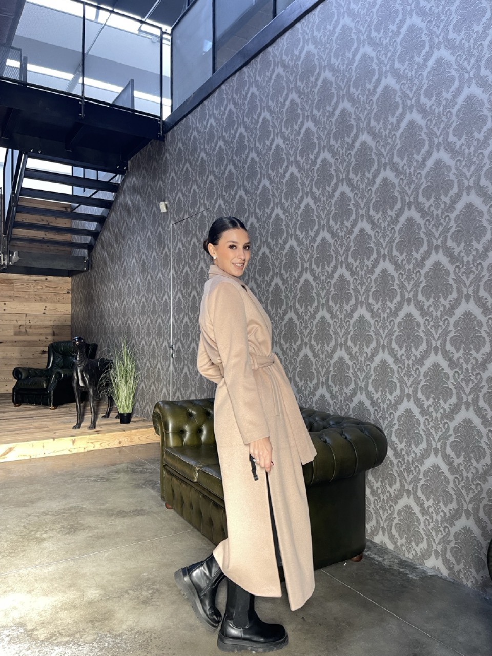 Cappotto lungo foderato con spacchi laterali, tasche e cintura in vita.