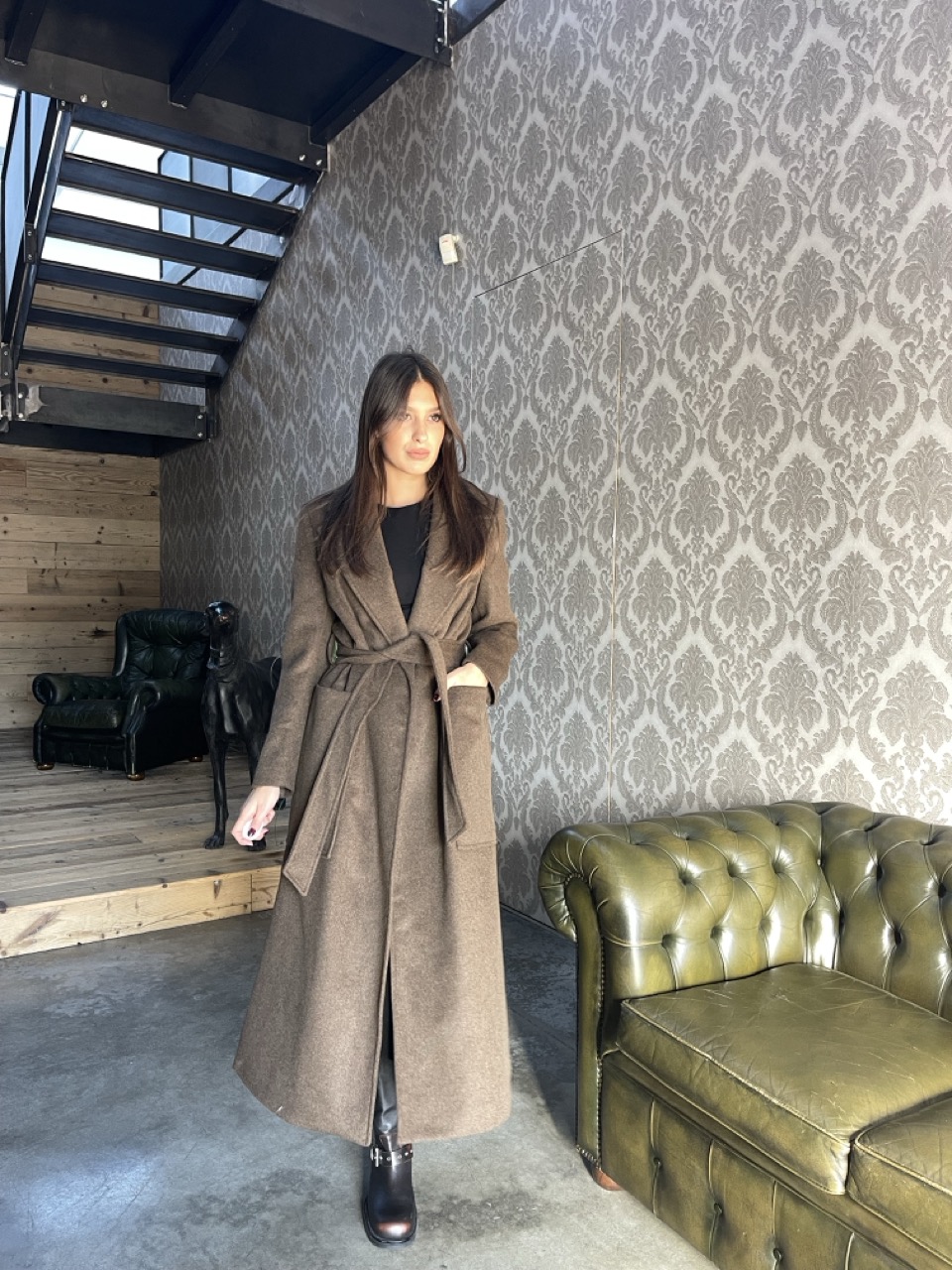 Cappotto lungo foderato con tasche laterali e cintura in vita.