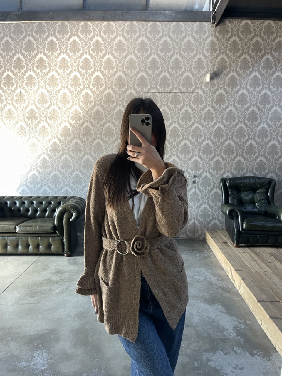 Cardigan in maglia con cintura in vita, tasche laterali e volant sulle maniche.