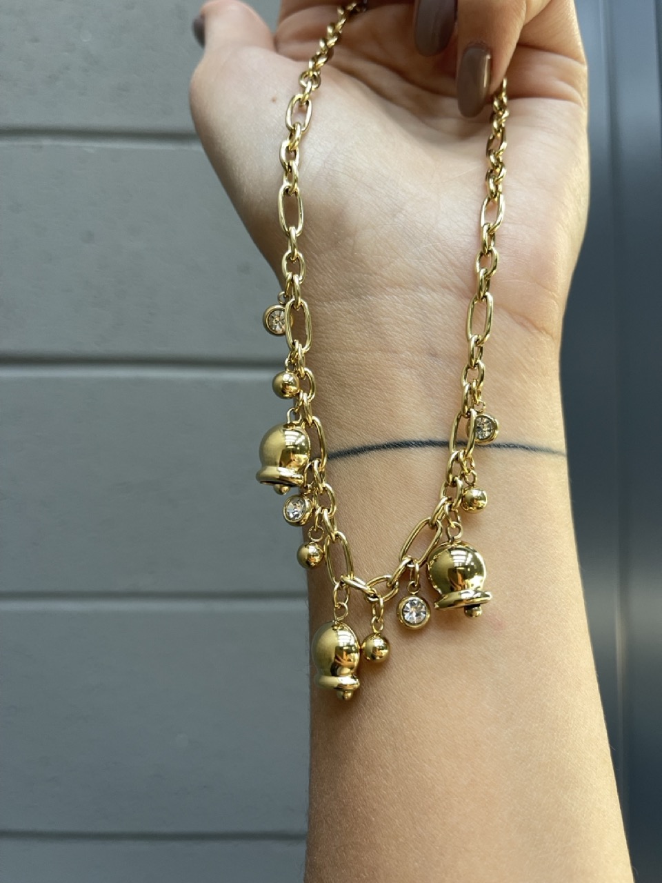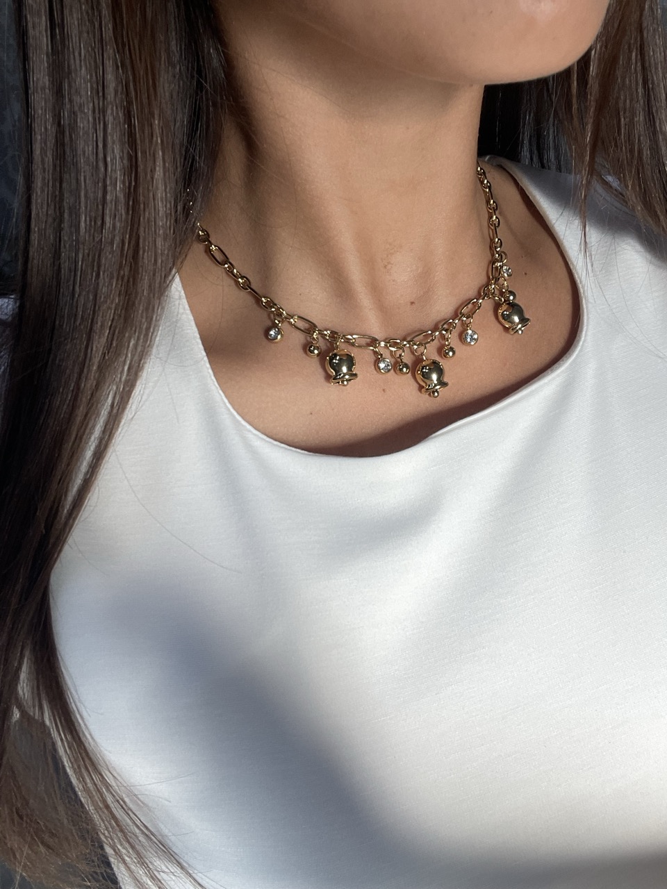 Collana con ciondoli e strass dettaglio e chiusura con gancino.
