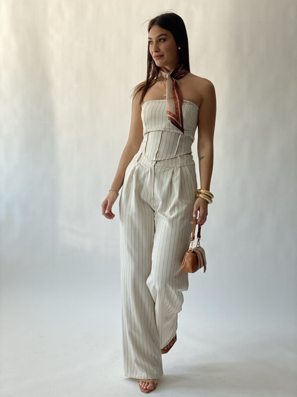 – Pantalone modello a palazzo a vita medio alta con elastico in vita dietro.