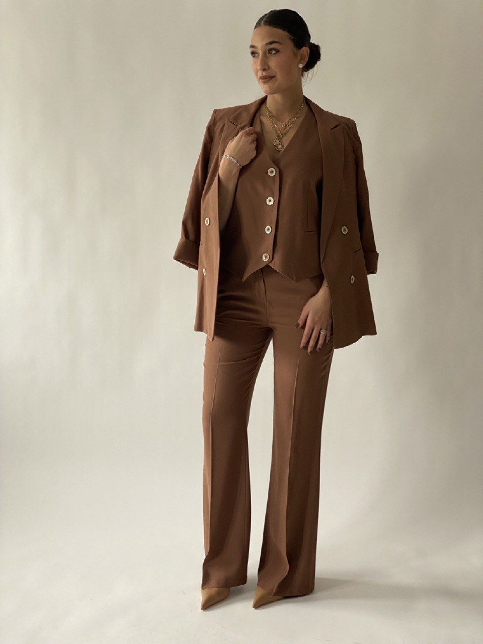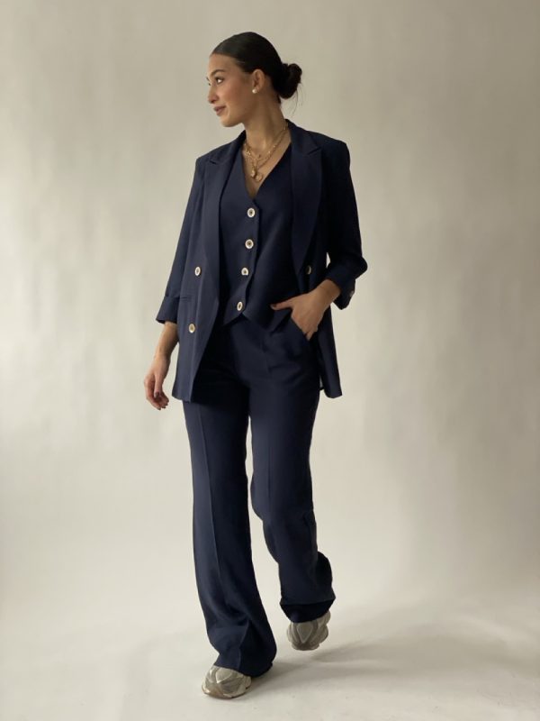 – Pantalone modello a palazzo a vita medio alta con tasche laterali.