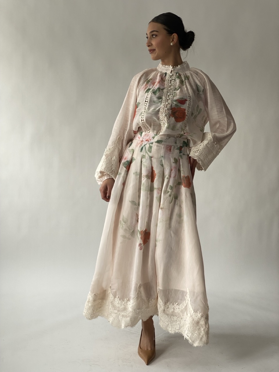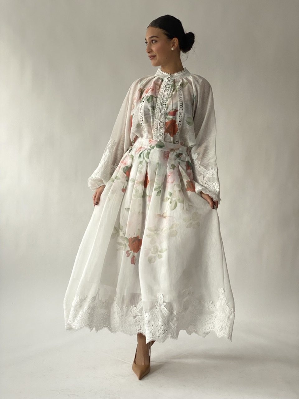 – Gonna ampia con elastico in vita dietro e zip laterale come chiusura.