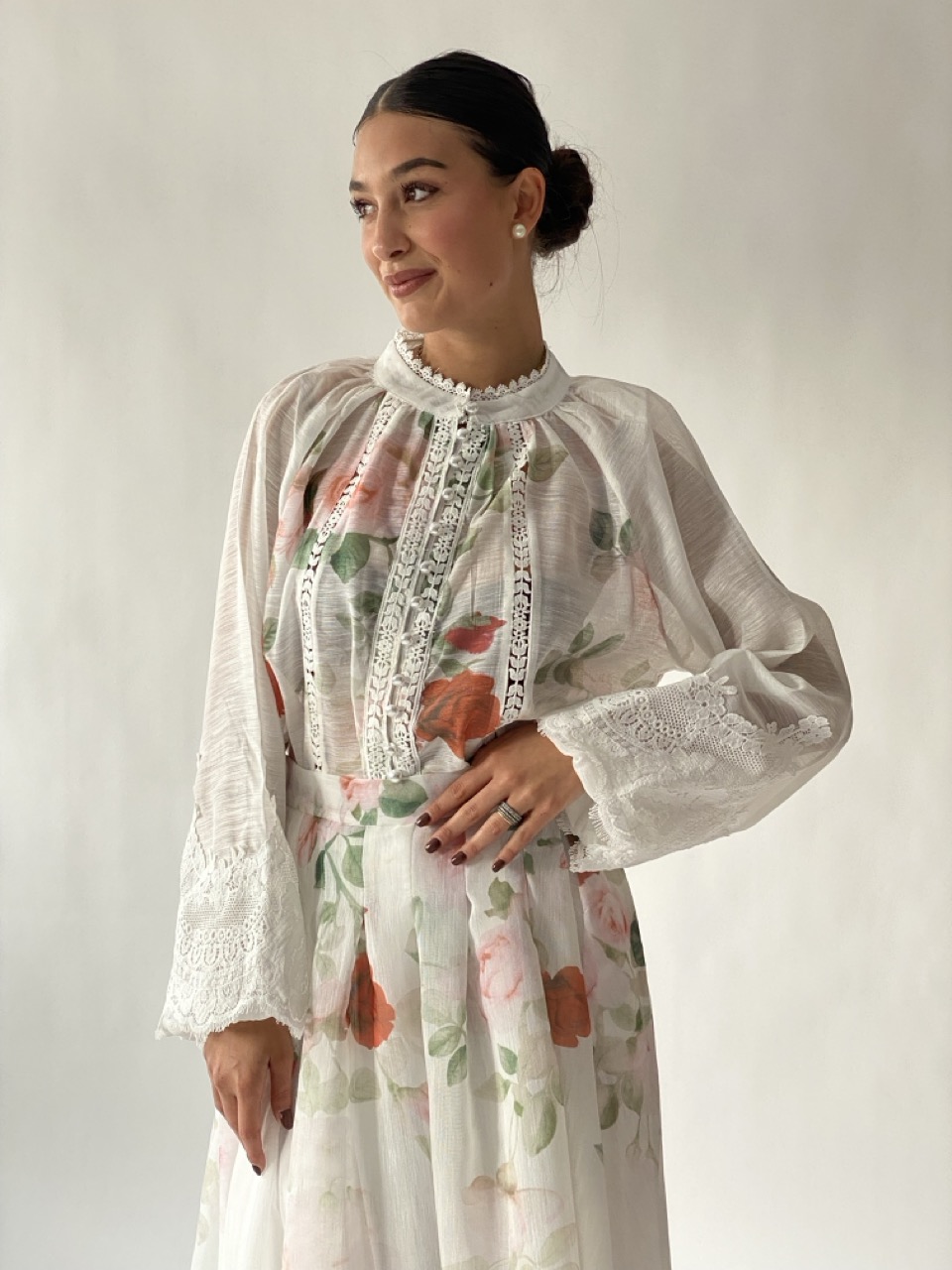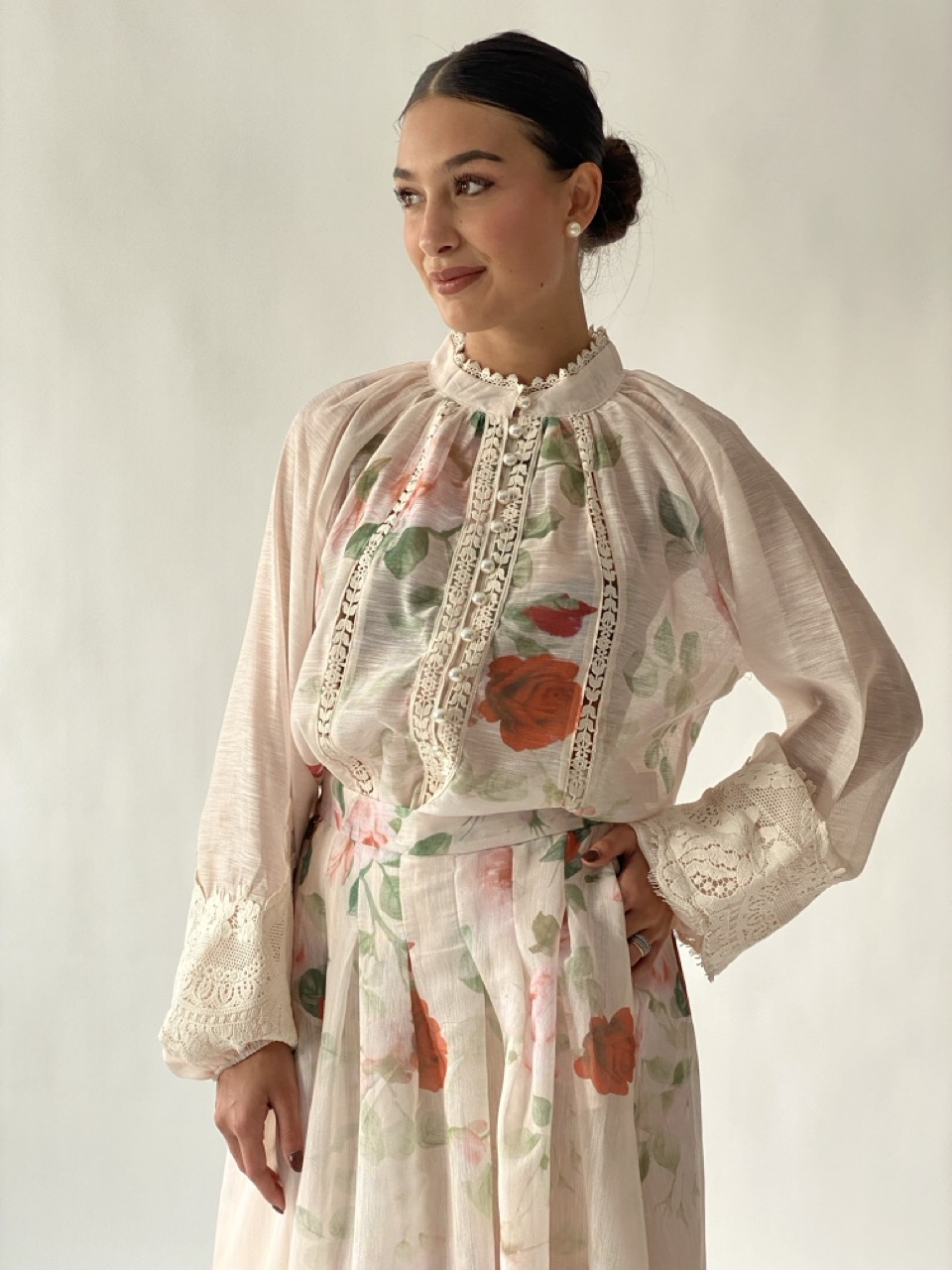 – Camicia con maniche ampie, pizzo e perle dettaglio