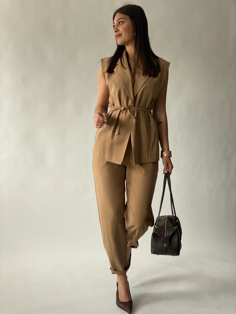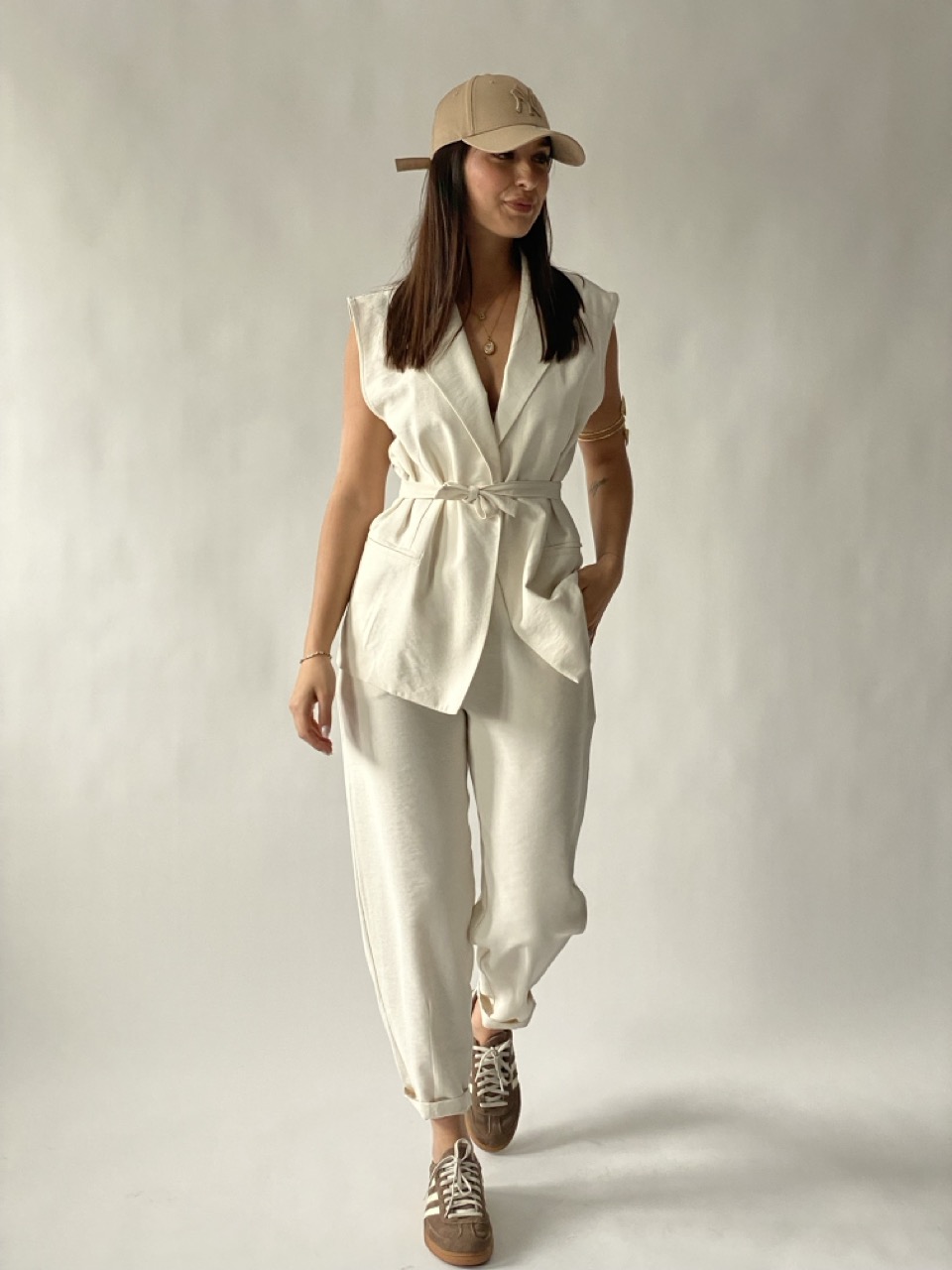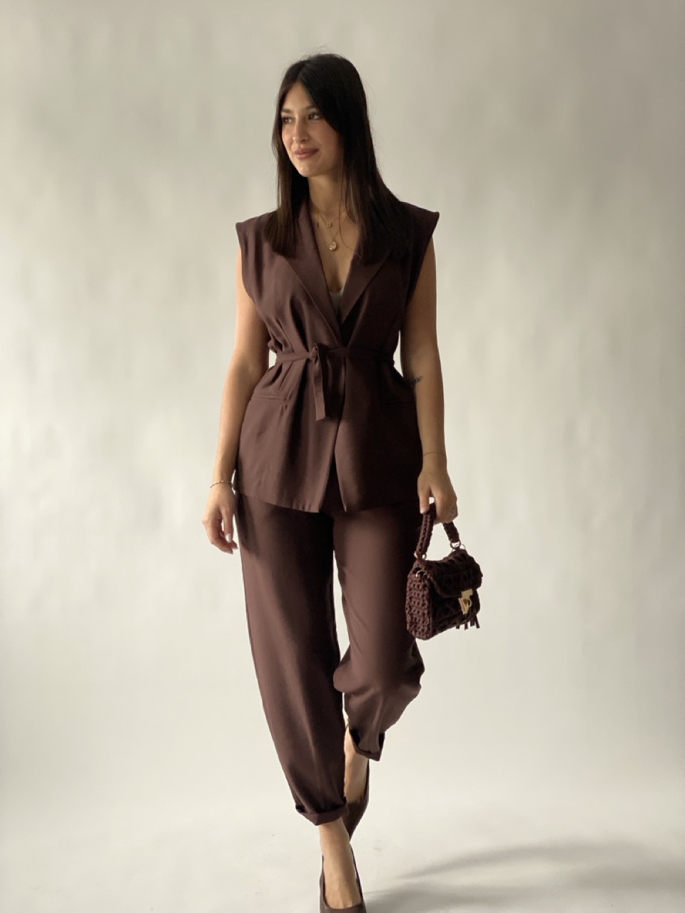 – Gilet con bottone e cintura in vita.