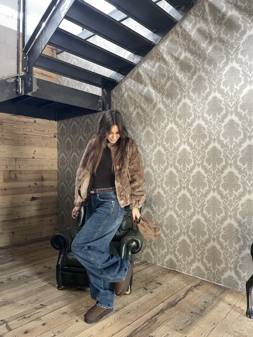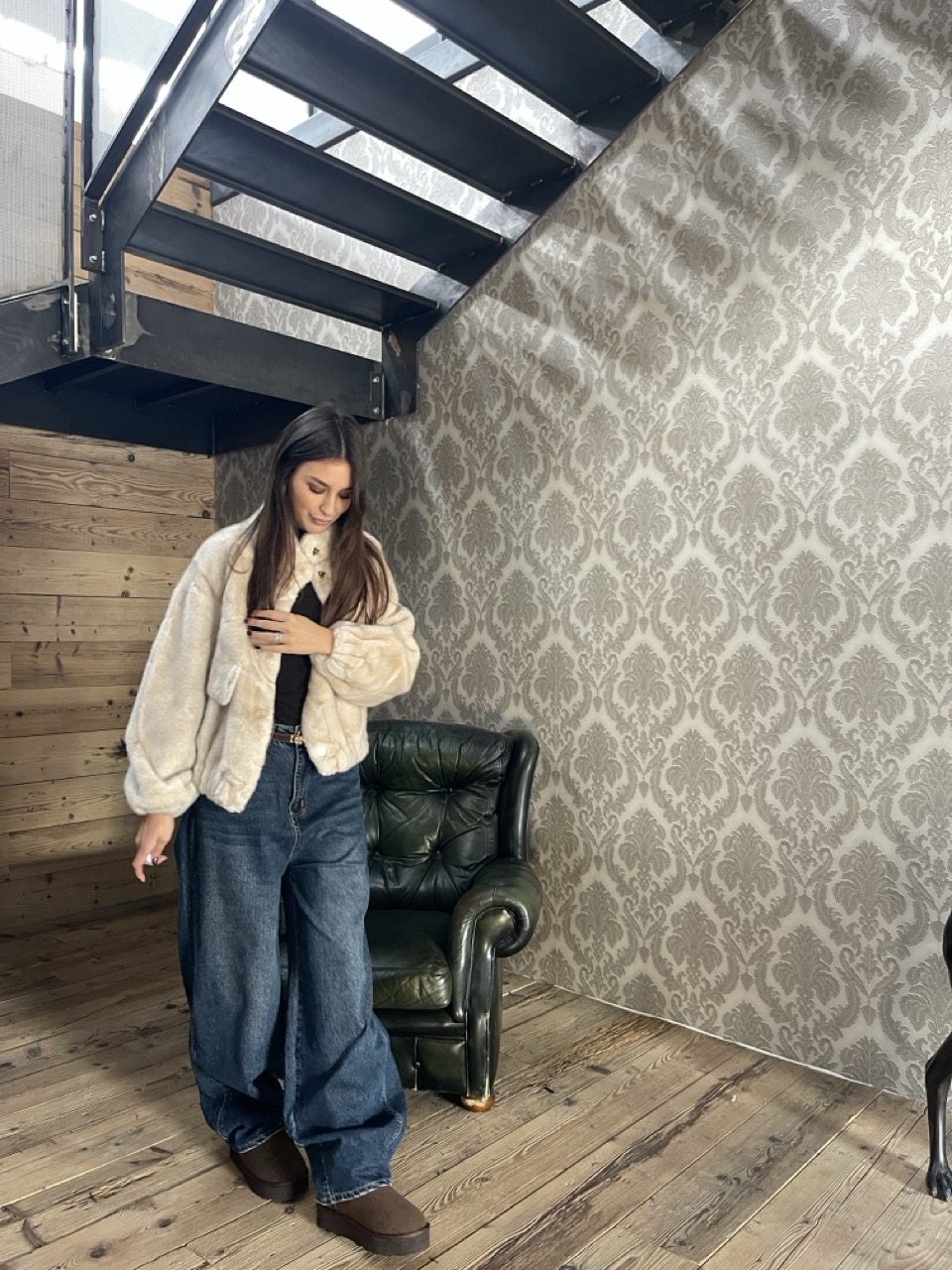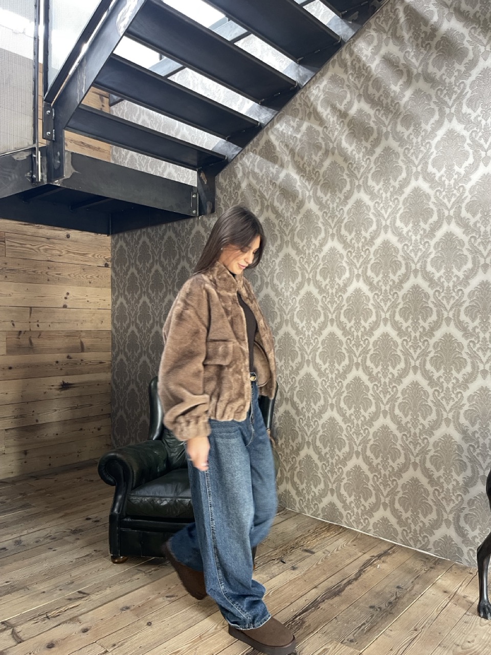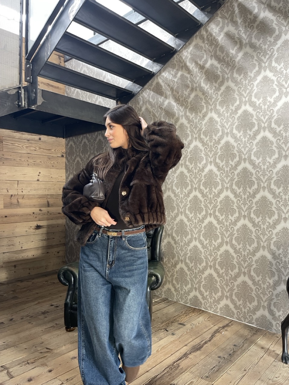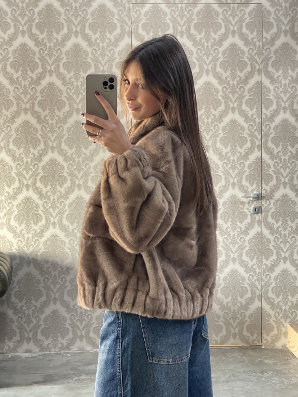 Ecopelliccia con tasche frontali finte e chiusura con bottoni a clip.