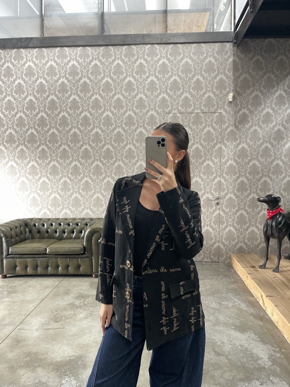 Giacca-Blazer non foderata con scritte a contrasto e doppio bottone centrale come chiusura.