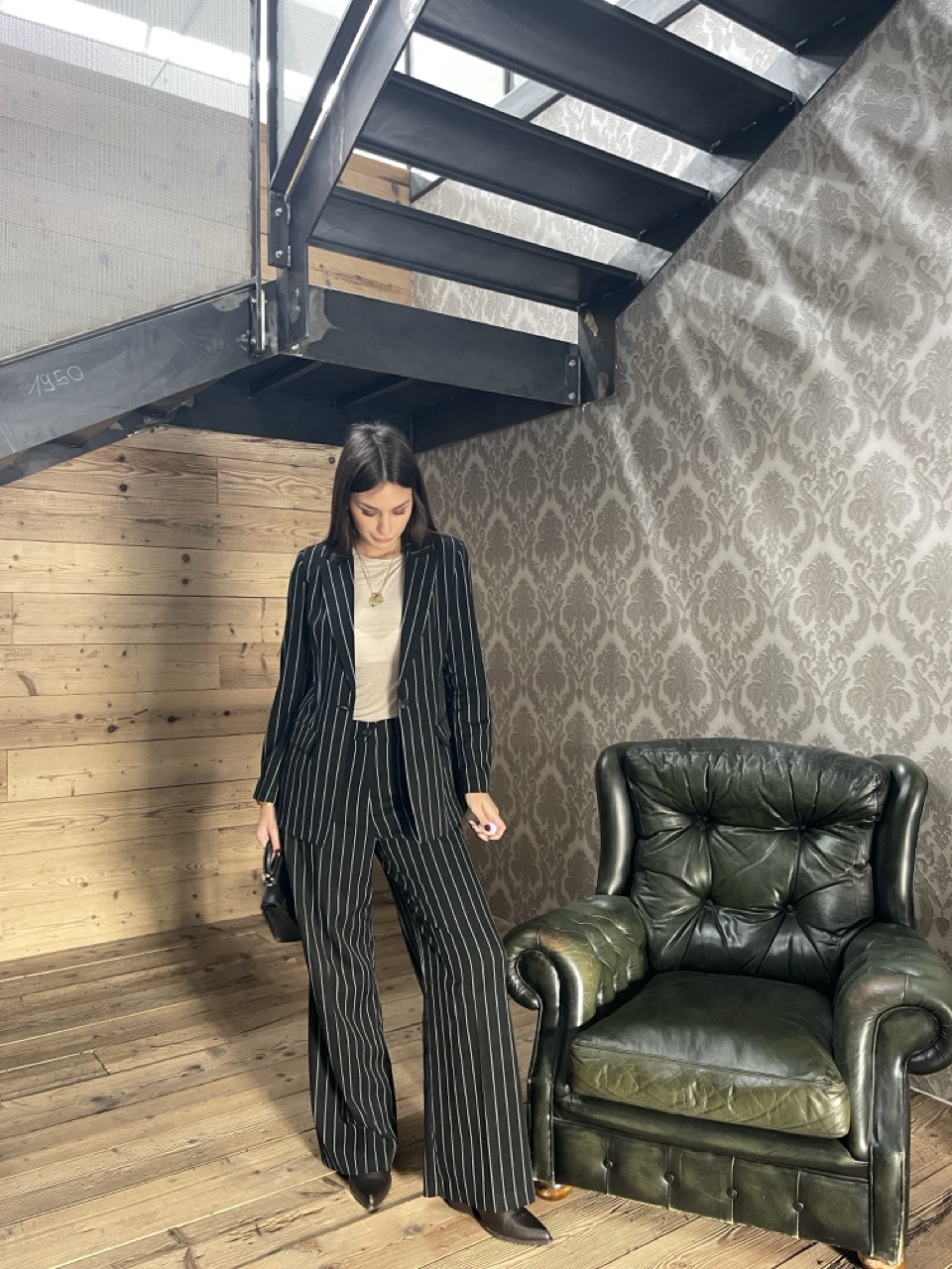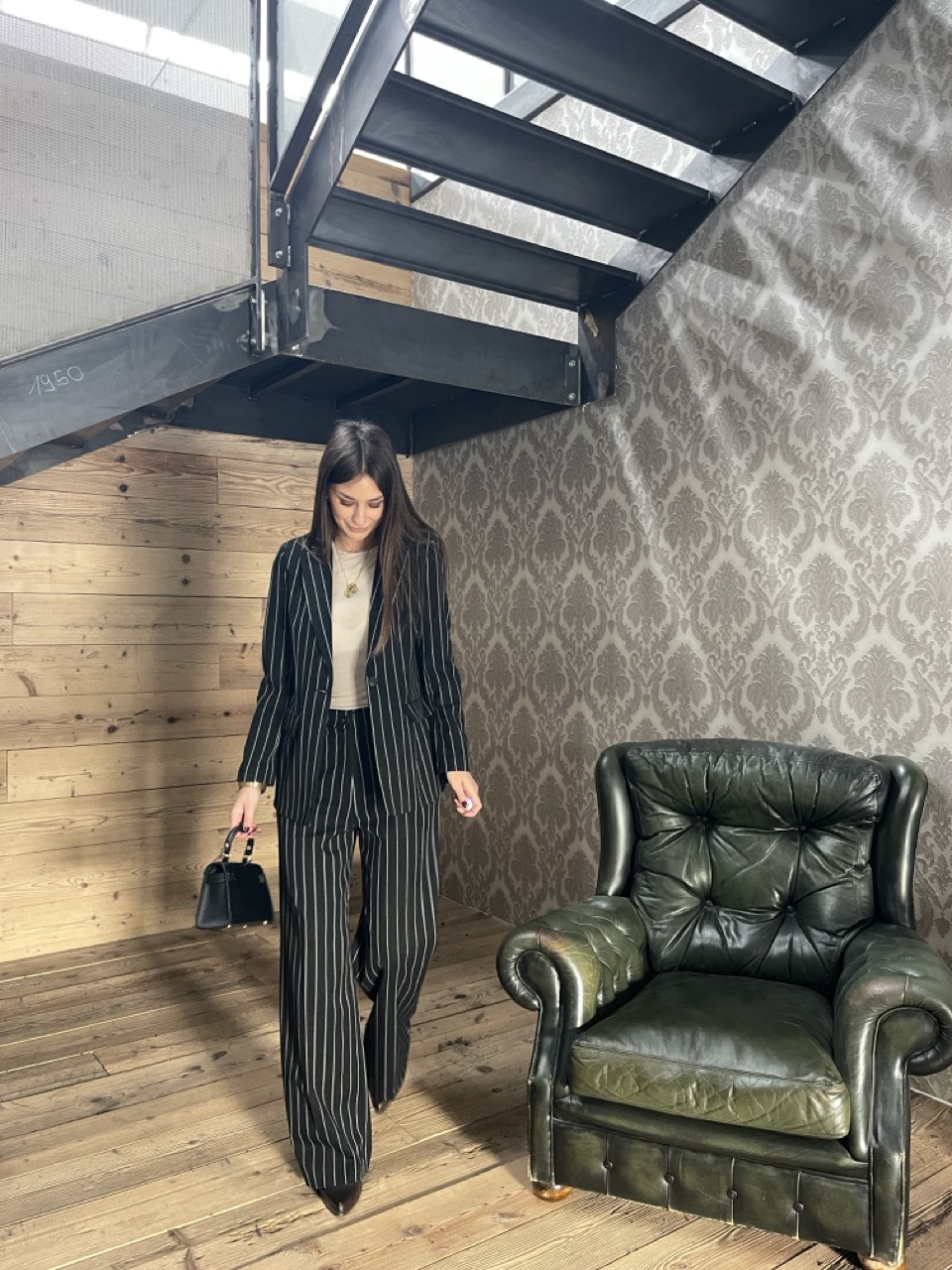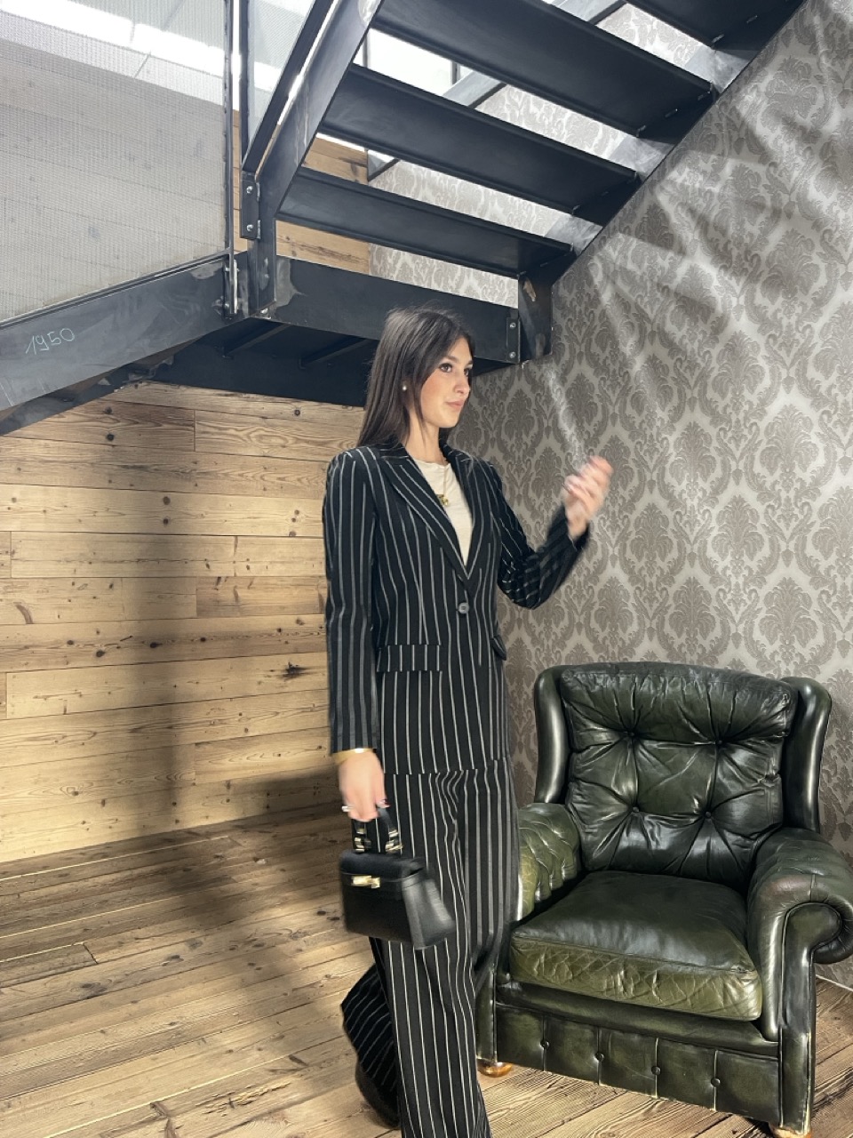 Giacca/Blazer gessata con spalline imbottite, tasche laterali e chiusura con bottone centrale.