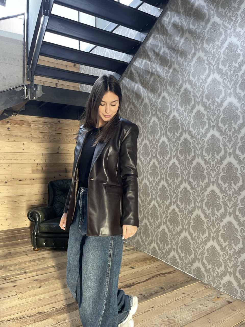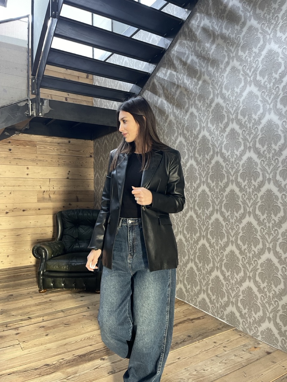 Giacca/Blazer in ecopelle NANEBI foderata con spalline imbottite e chiusura con bottone centrale.