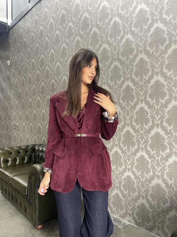 Giacca-Blazer in velluto con bottoncino centrale come chiusura, tasche finte laterali, spalline leggermente imbottite e fodera a quadri.