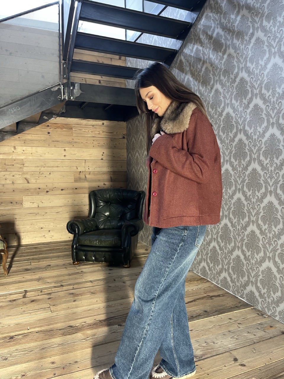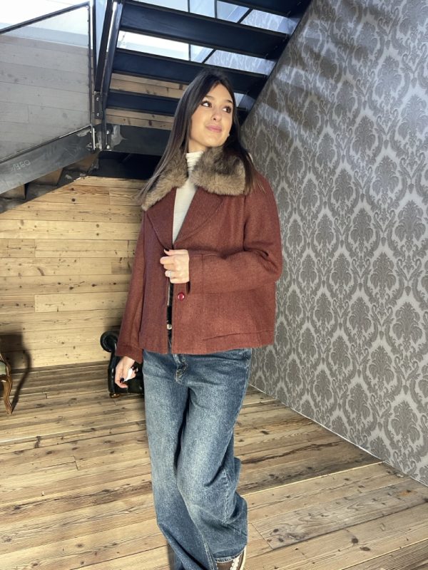 Giacca/Cappottino SUSY MIX non foderata con pelo sul collo removibile e bottoni centrali come chiusura.