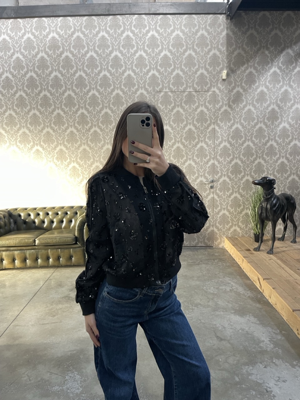 Giacca con trasparenze, paillettes dettaglio e zip centrale come chiusura.