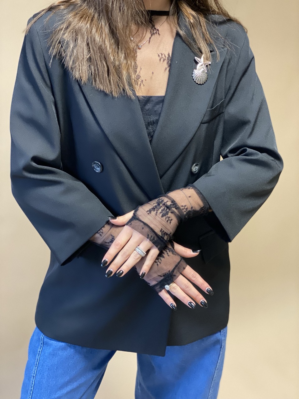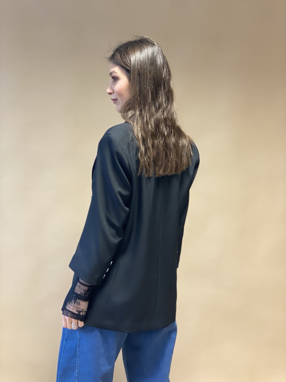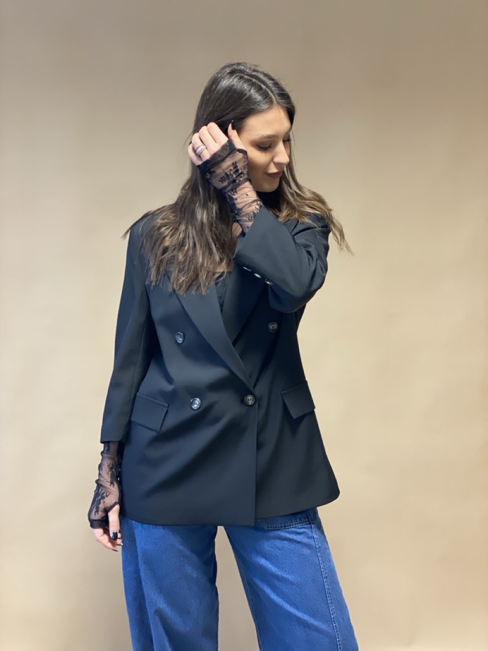 Giacca SUSY MIX modello doppiopetto con spalline imbottite, spilla dettaglio e manicotti in pizzo.