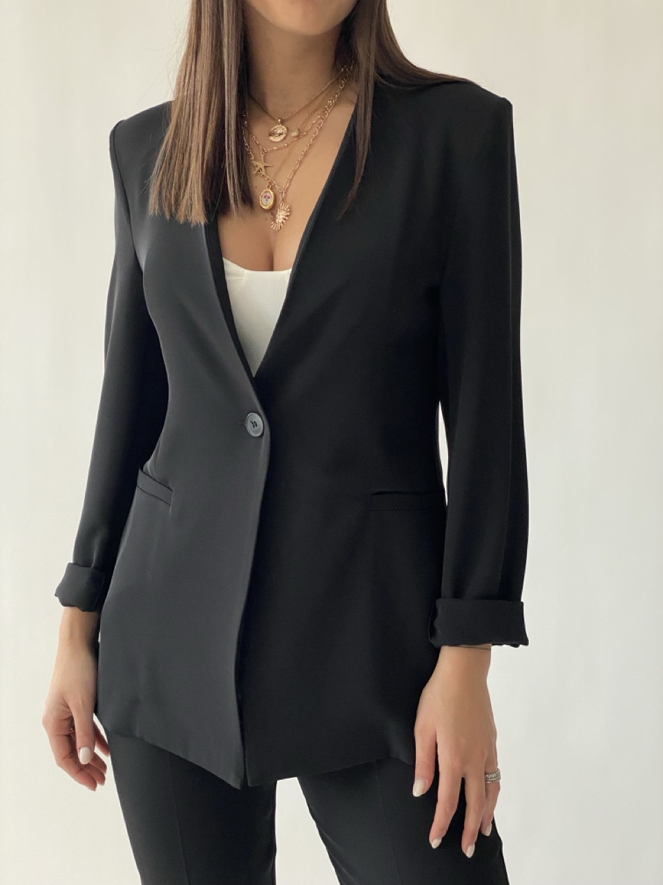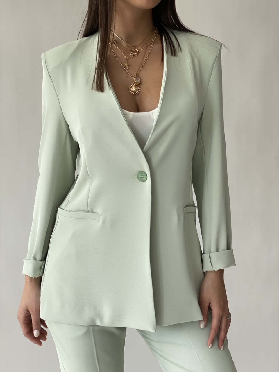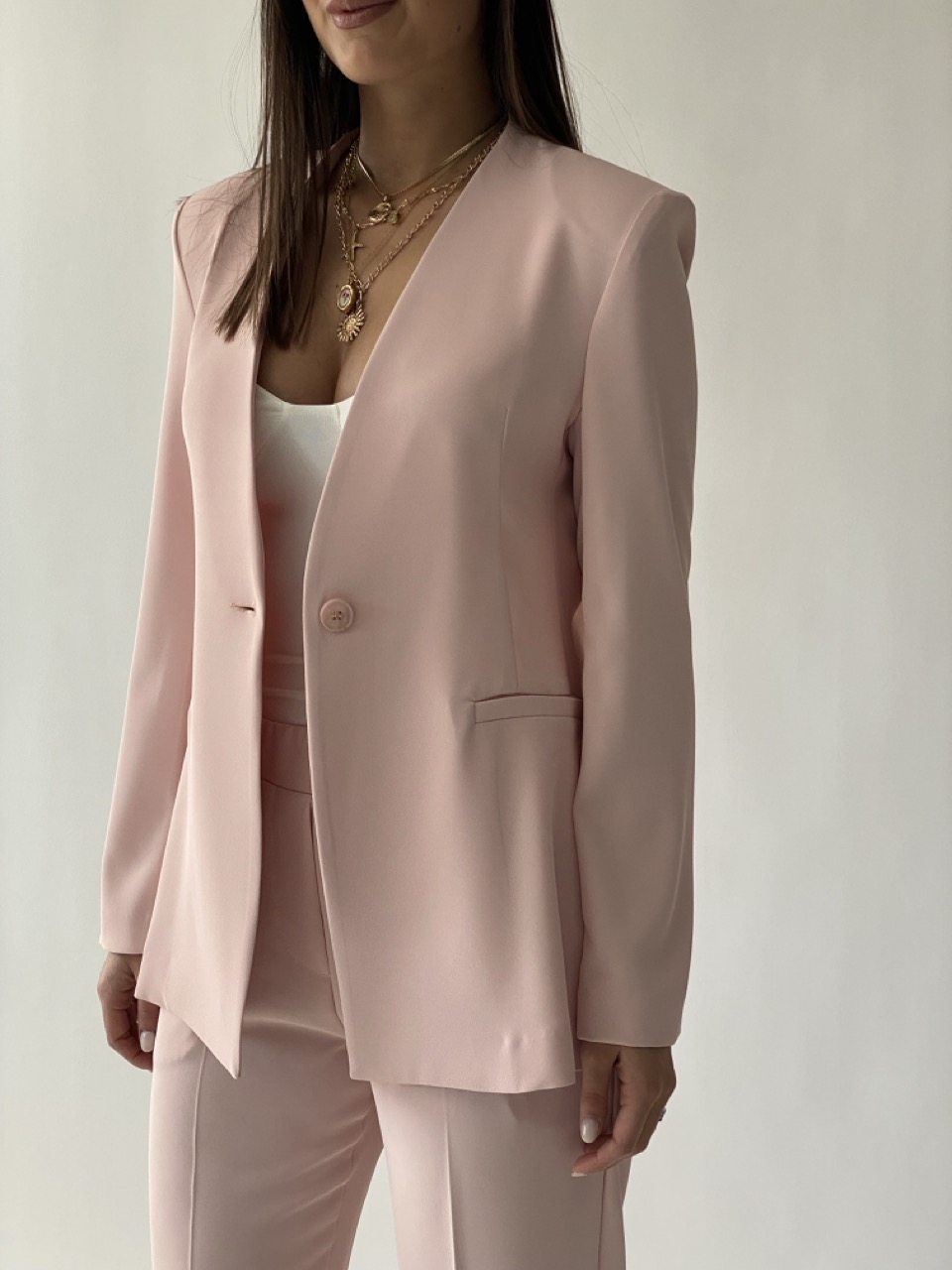 Giacca morbida non foderata con spalline imbottite e bottone centrale come chiusura.