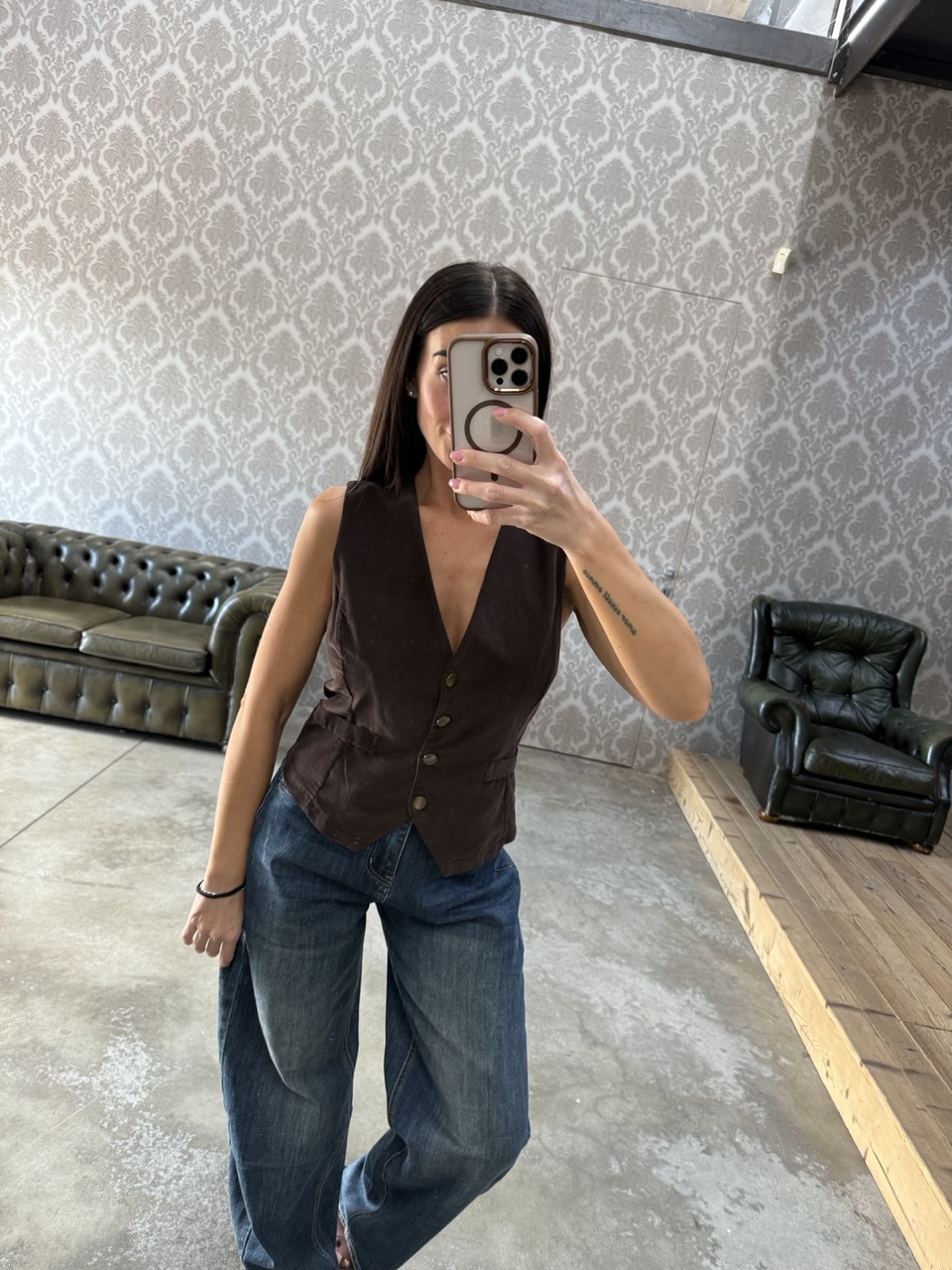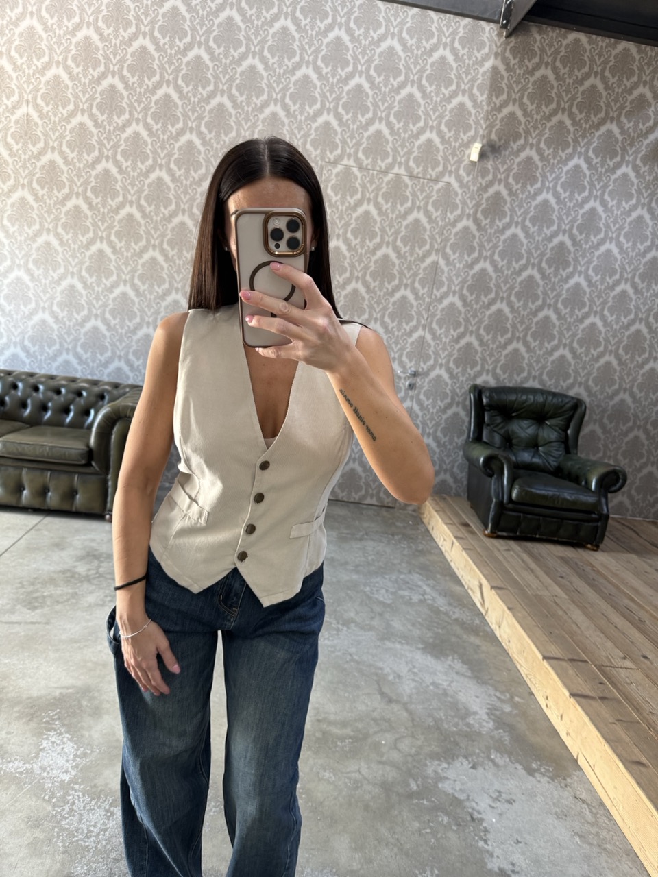 Gilet NANEBI in velluto a righe con tasche finte laterali e chiusura con bottoni color oro.