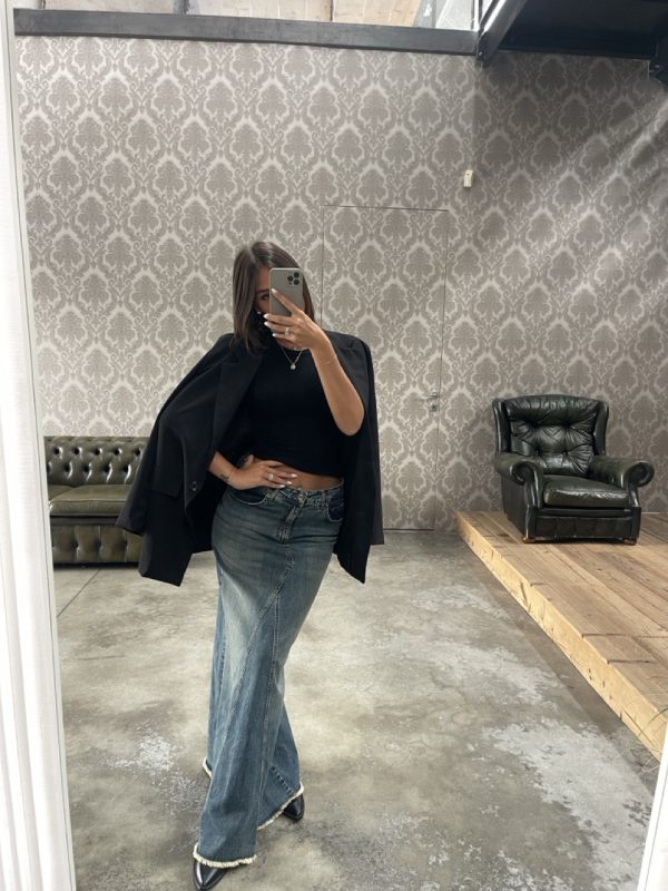 Gonna lunga LE STREGHE in jeans a vita medio alta con chiusura con bottone e zip.