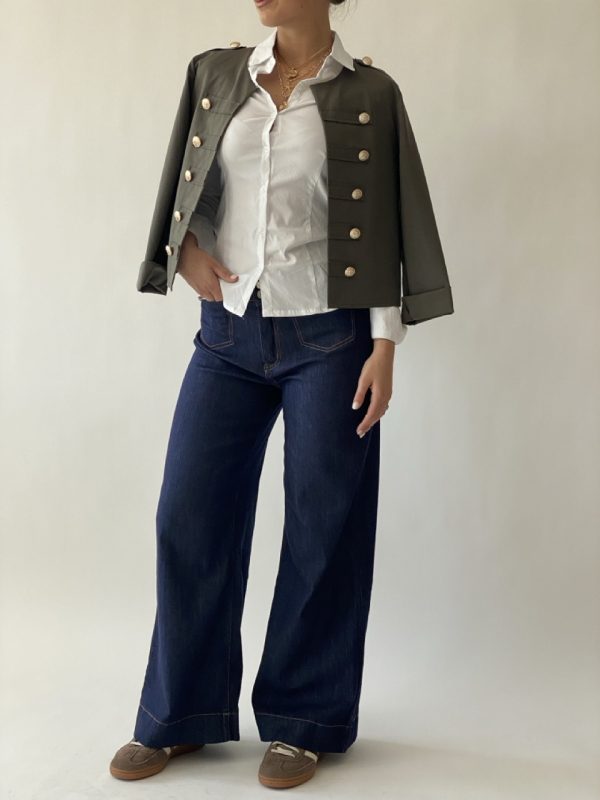 Jeans modello a palazzo elasticizzato a vita medio alta con tasche frontali e cuciture a contrasto.