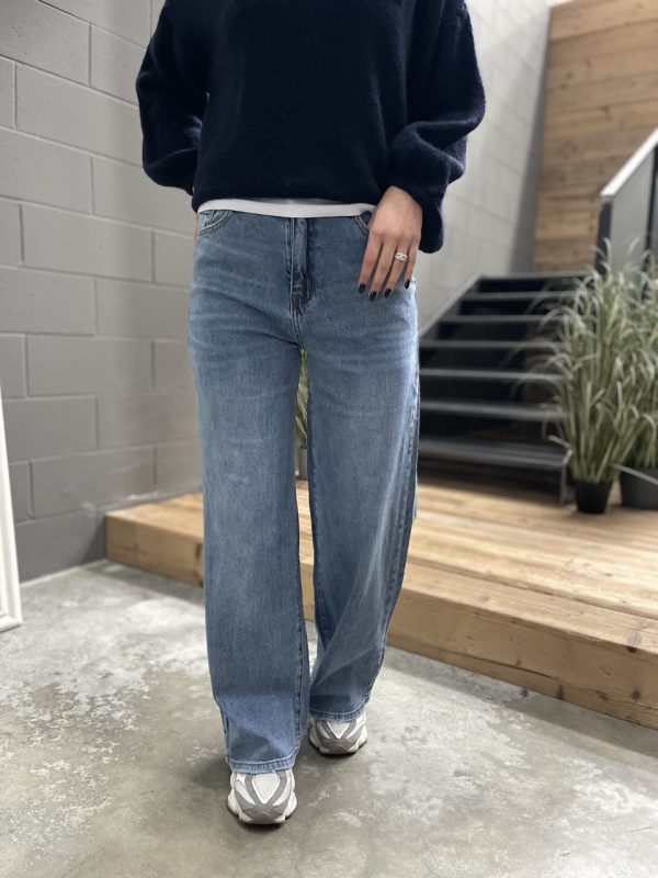 Jeans modello gamba dritta dritta a vita medio alta con chiusura con bottone e zip.