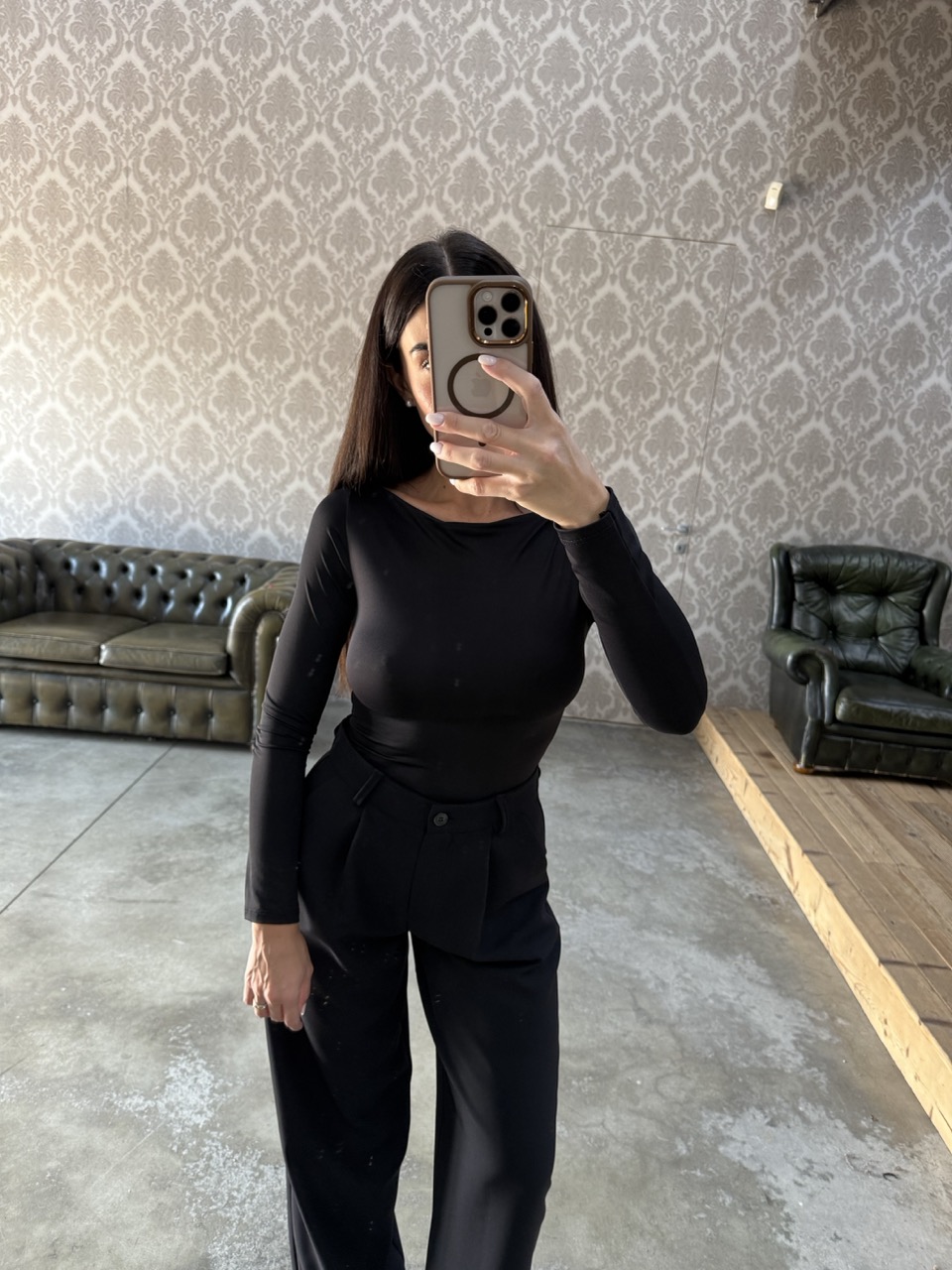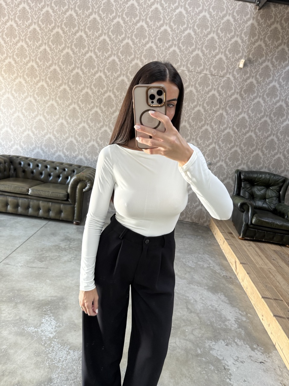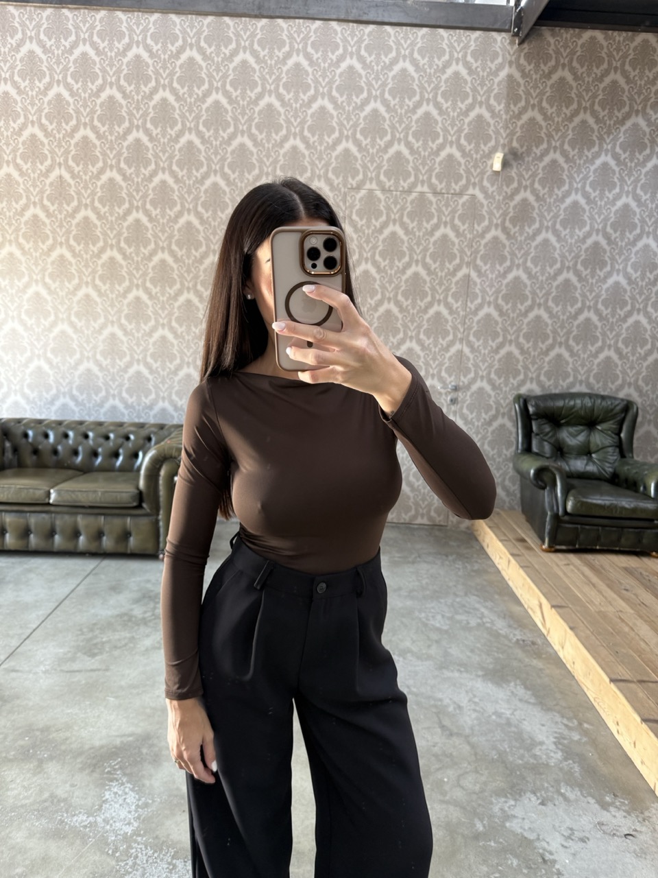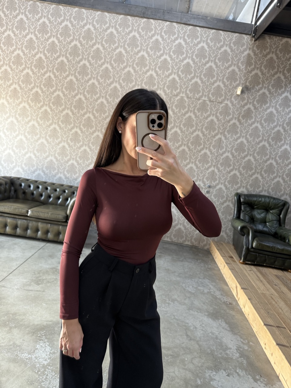 Maglia modello aderente/elasticizzata con scollo a barchetta.