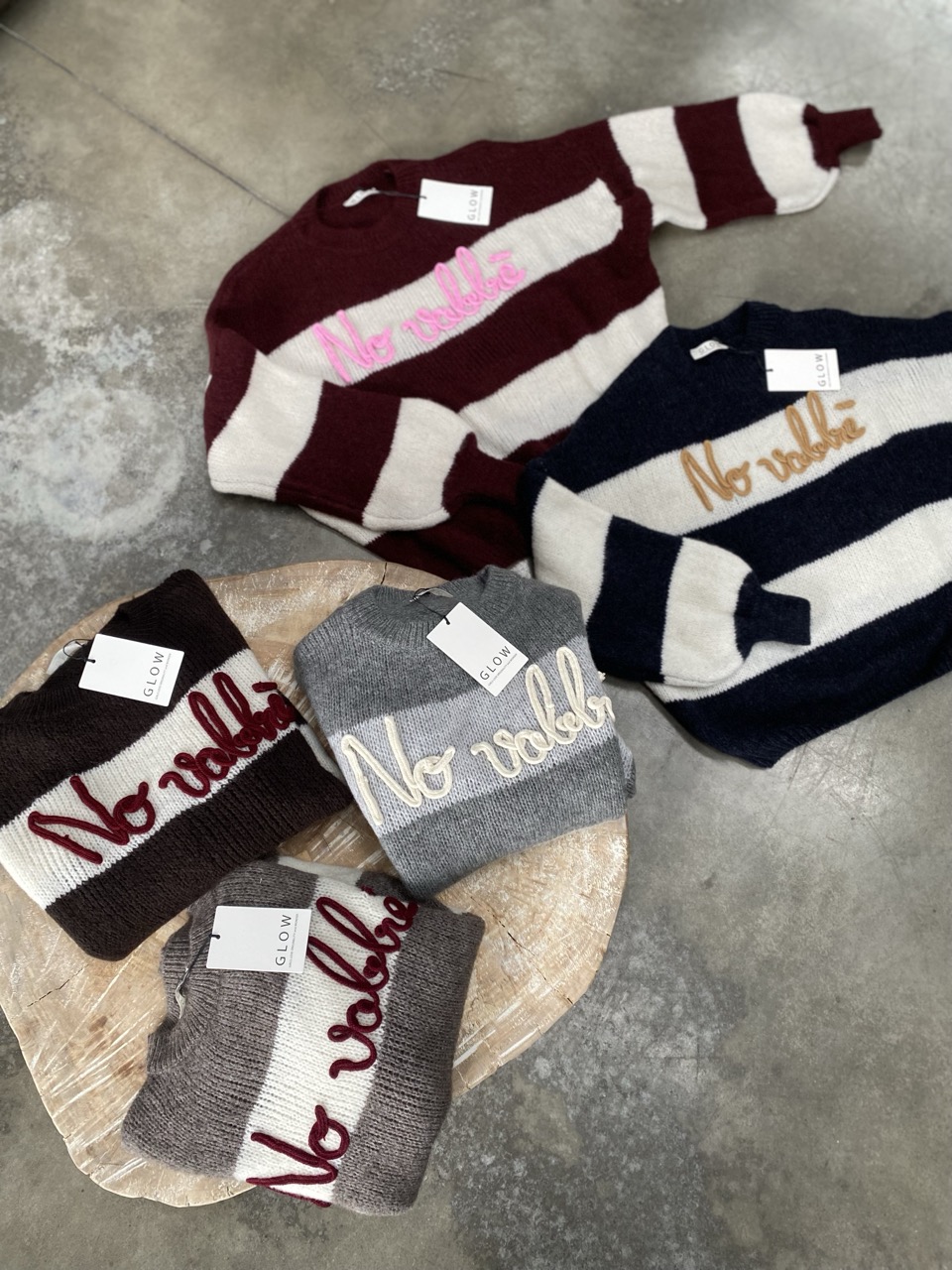 Maglione a righe con scritta ricamata ‘No vabbè’.