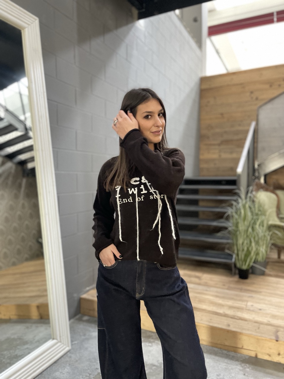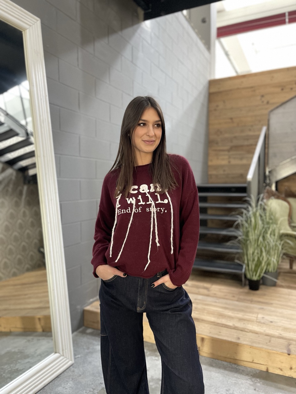 Maglione SUSY MIX a girocollo con scritta ricamata dettaglio.
