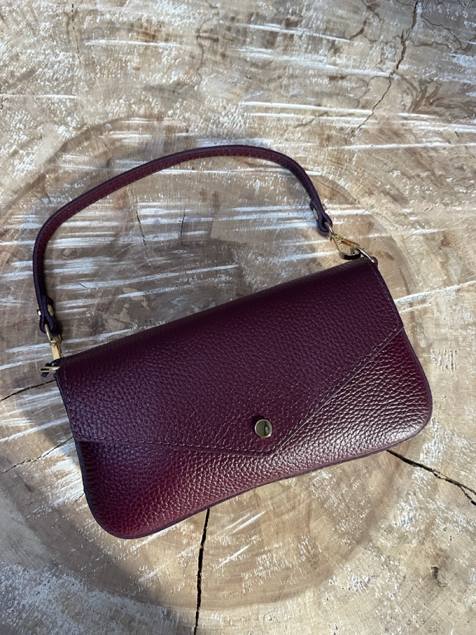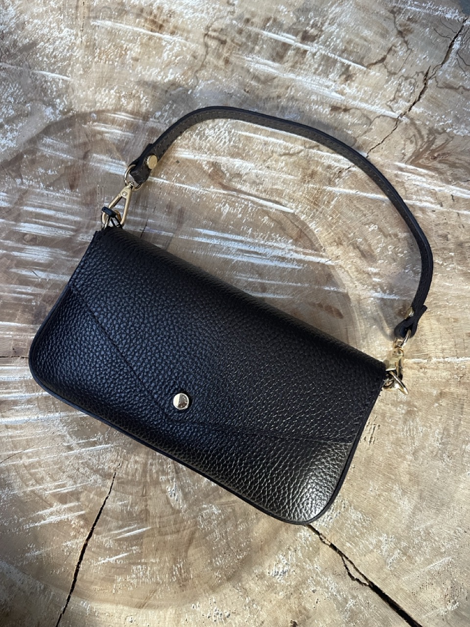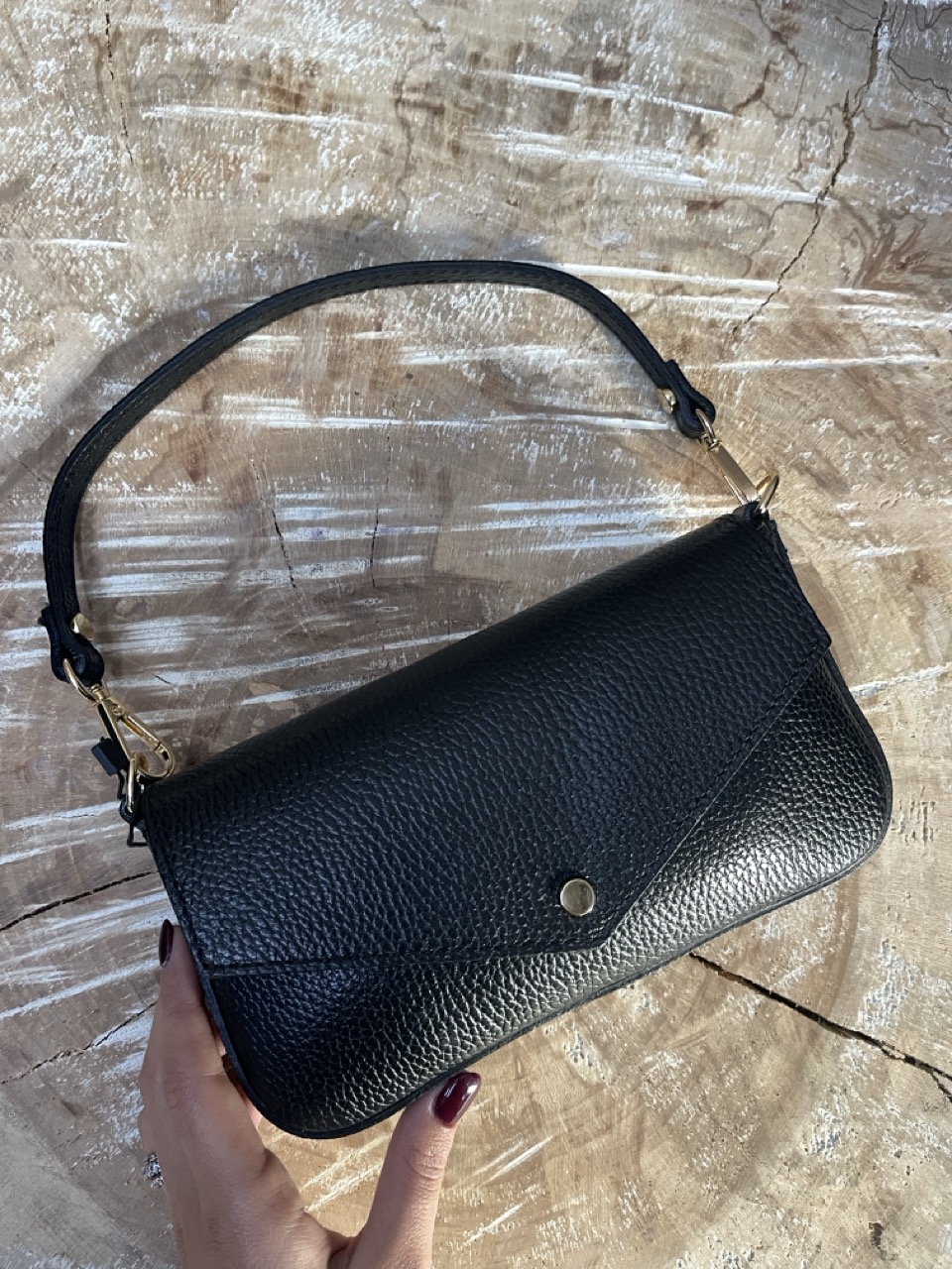 Mini bag in pelle con tracolla all’interno color oro e bottone con chiusura a clip.
