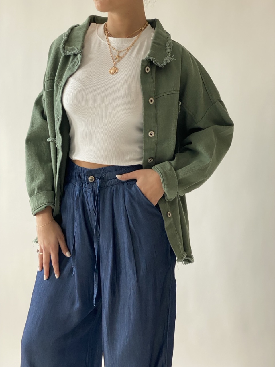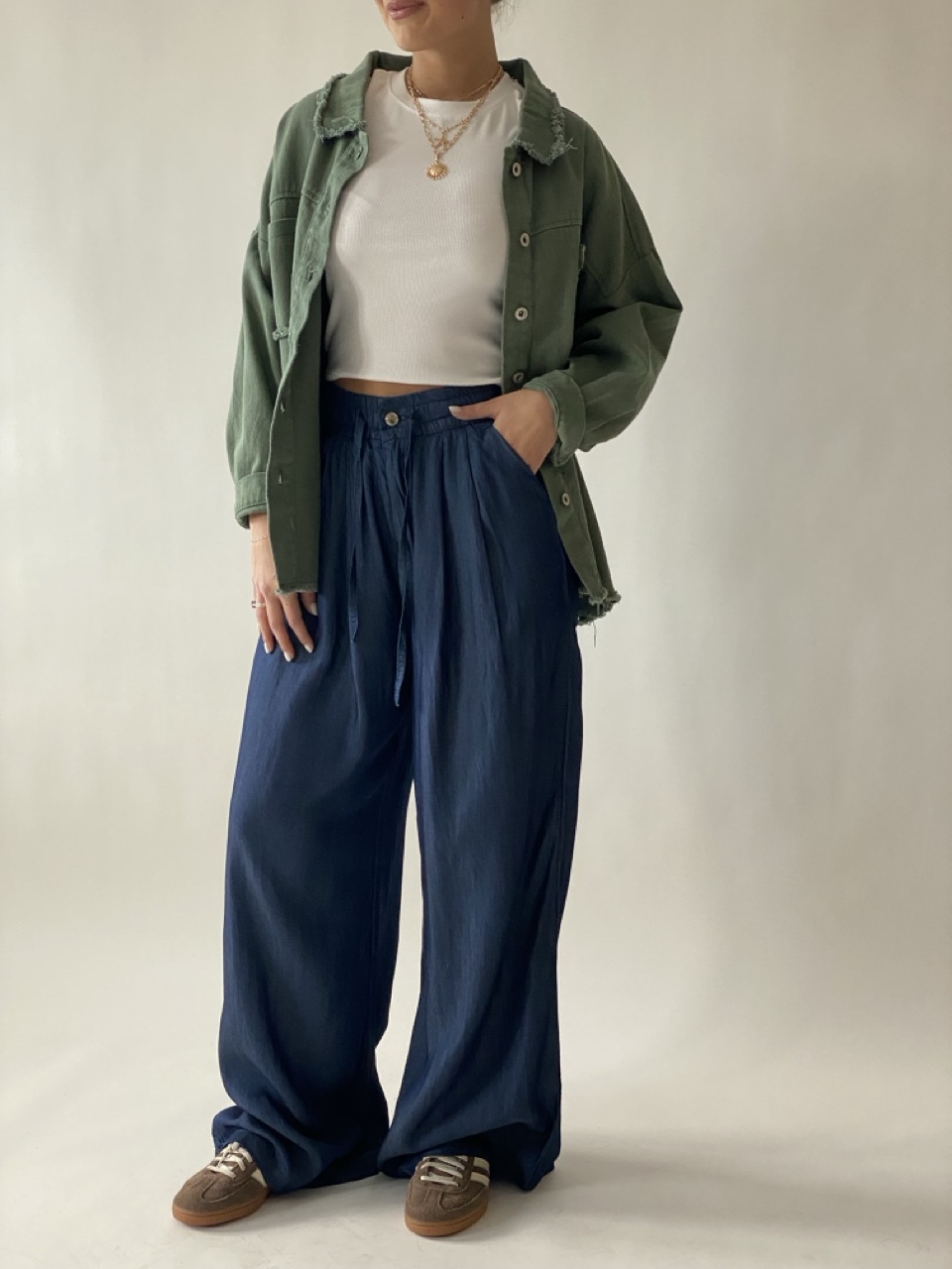 Pantalone modello a palazzo a vita medio alta con tasche laterali ed elastico in vita.