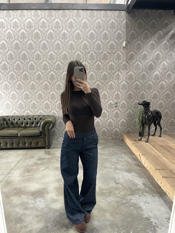 Pantalone modello a palazzo a vita medio alta con tasche laterali e chiusura con bottone e zip.