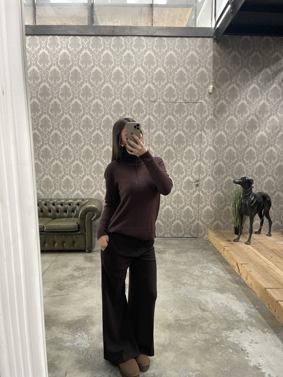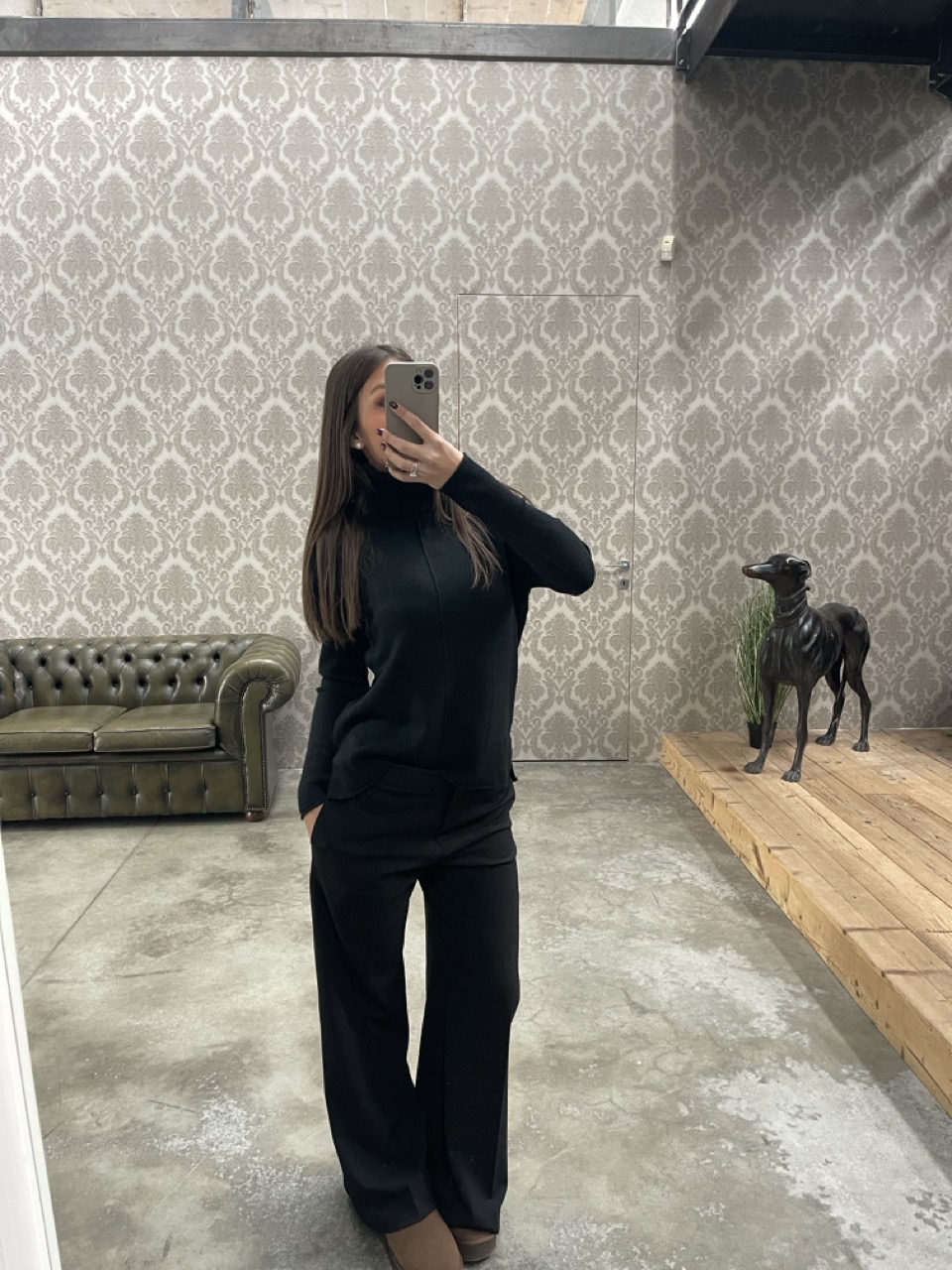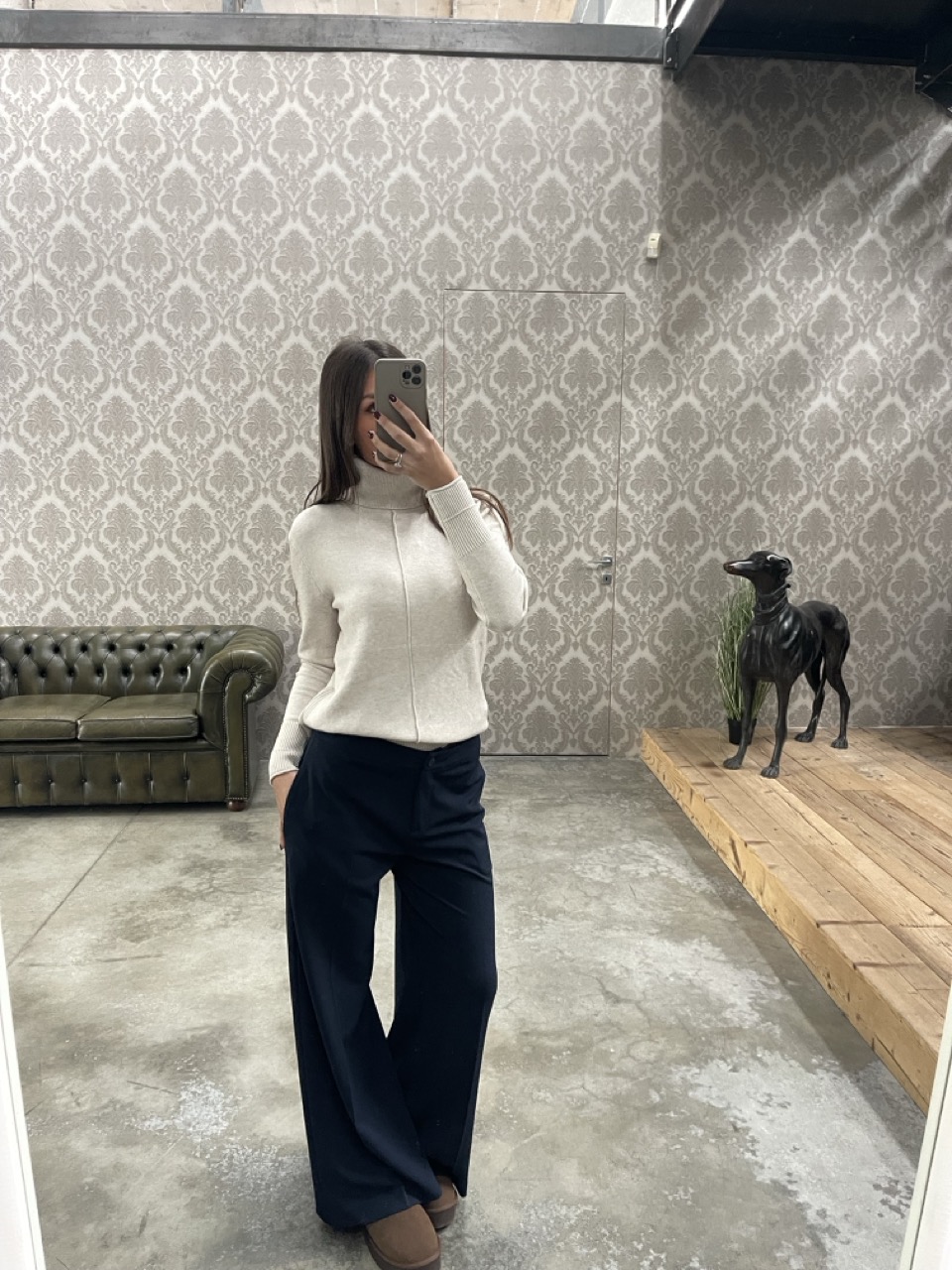 Pantalone modello a palazzo a vita medio alta con tasche laterali e chiusura con bottone e zip.