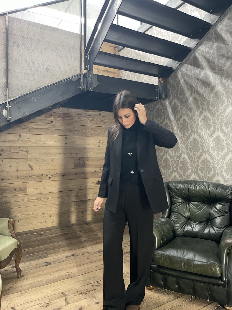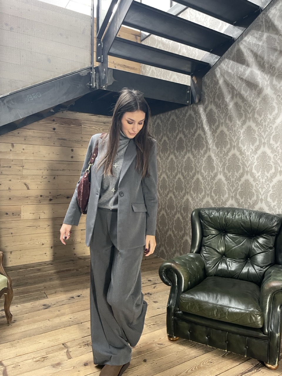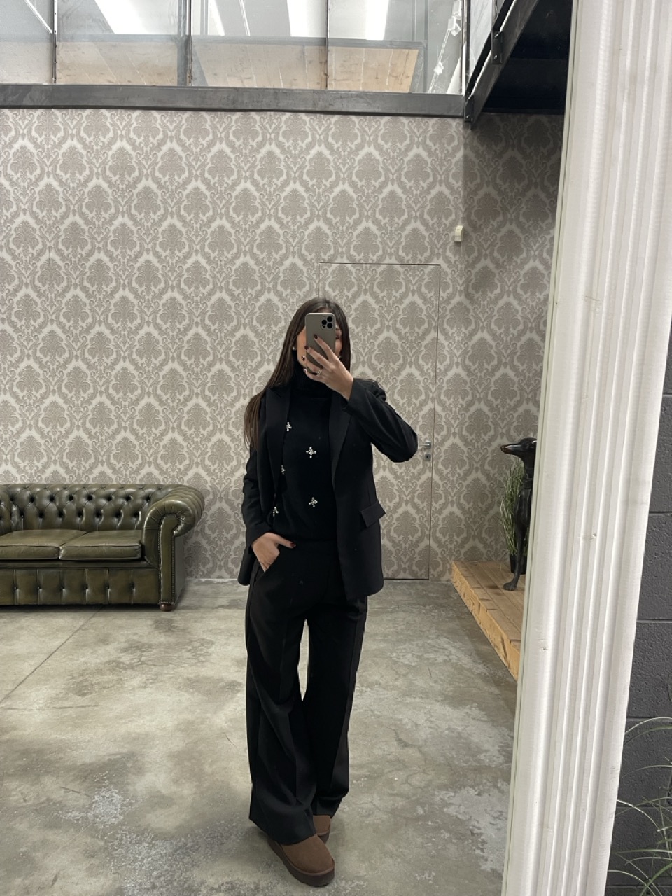 Pantalone modello a palazzo a vita medio alta con elastico in vita dietro e tasche laterali.