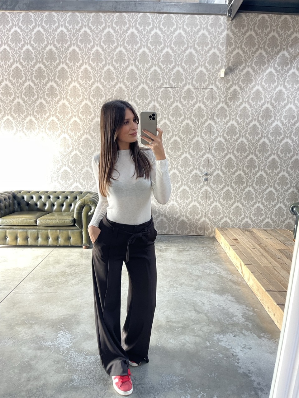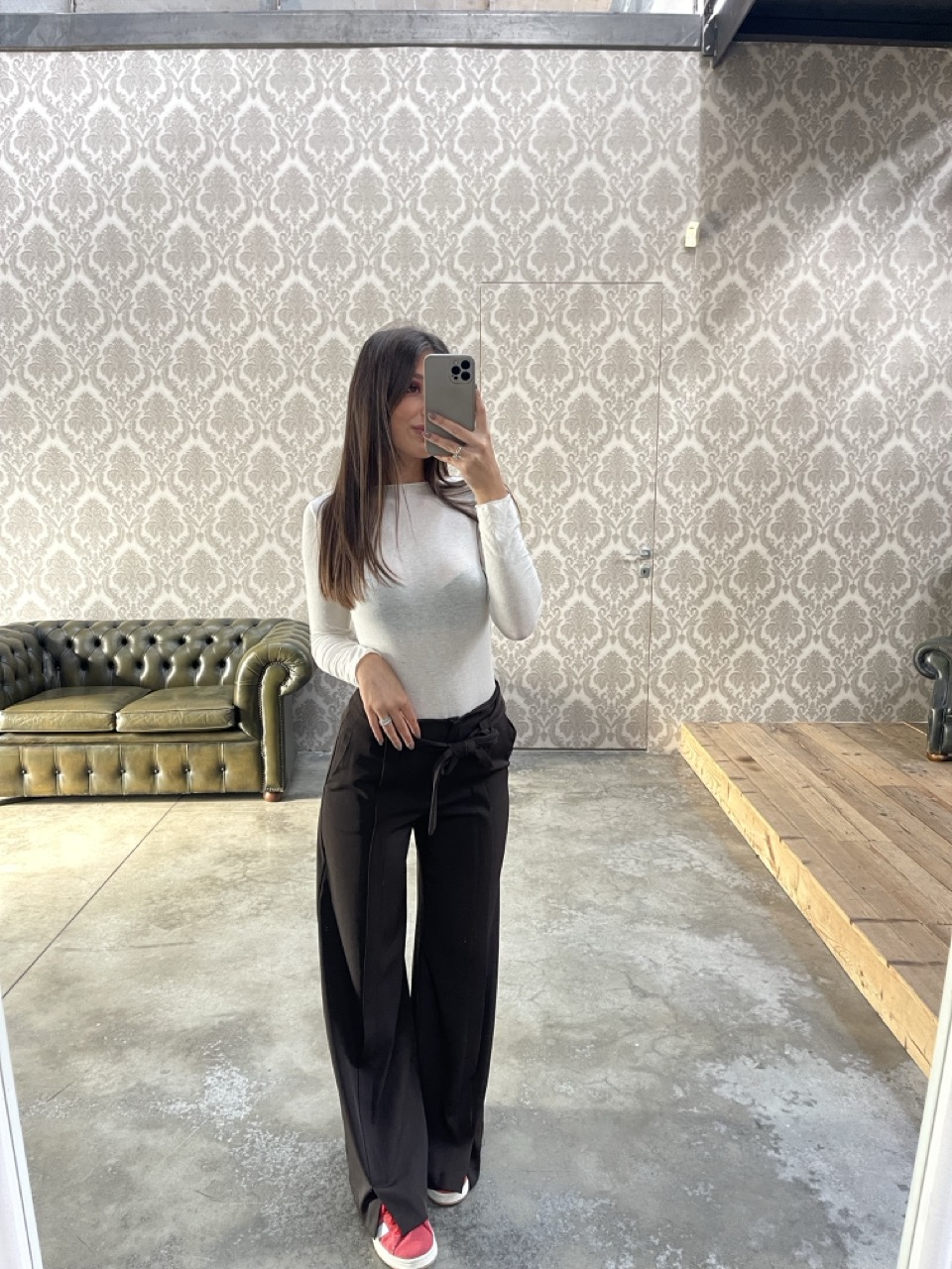 Pantalone NANEBI modello a palazzo a vita medio alta con cintura in vita.