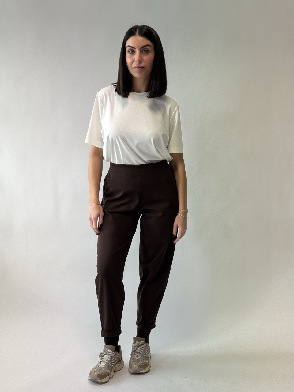 Pantalone baggy in punto milano con tasche laterali e elastico in vita sul retro.