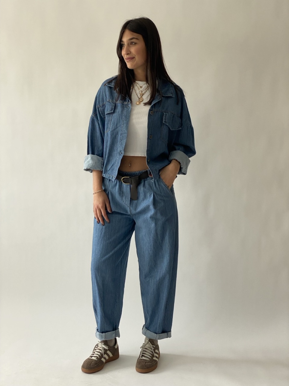 Pantalone modello balloon con elastico in vita, cintura e tasche laterali.